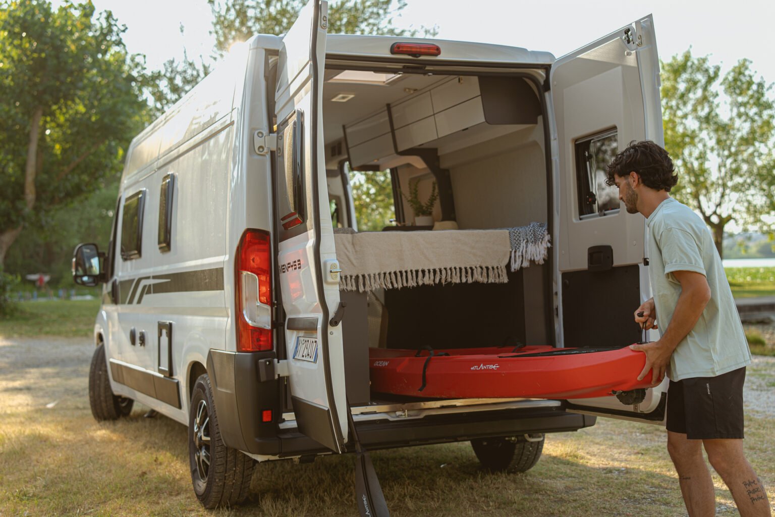 El bloque de cocina lineal de Menfys Next está equipado con una placa de dos fuegos y un fregadero, para que puedas preparar fácilmente un rápido tentempié o un delicioso almuerzo. El frigorífico de compresor de 84 litros, situado bajo la cocina en el lado de la entrada, es accesible tanto desde el interior como desde el exterior de la furgoneta gracias a su apertura de 180°, para que puedas disfrutar de tus vacaciones en plein air con facilidad. Todo en su sitio con los cajones y el espacioso mueble alto con tirador oculto y luz táctil LED integrada para una cocina organizada, práctica y funcional.