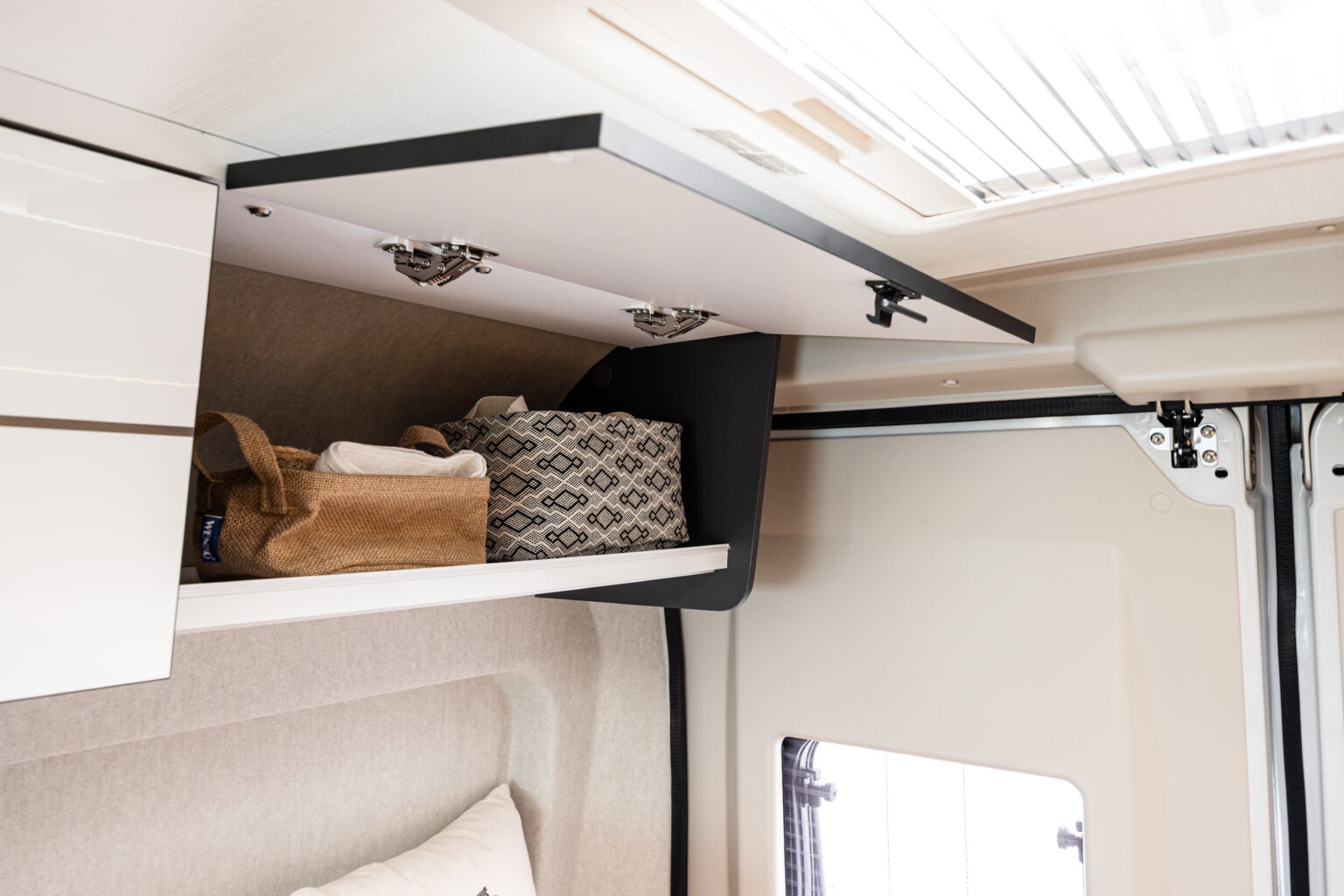La mesa ergonómica con extensión garantiza la máxima flexibilidad, perfecta para cualquier momento del día, tanto dentro como fuera del vehículo. Para que el espacio sea aún más funcional, cuenta con un práctico armario colgante, un portaobjetos sobre la cabina, compartimentos integrados y cómodos portavasos, para viajar siempre con orden y con todo a mano.