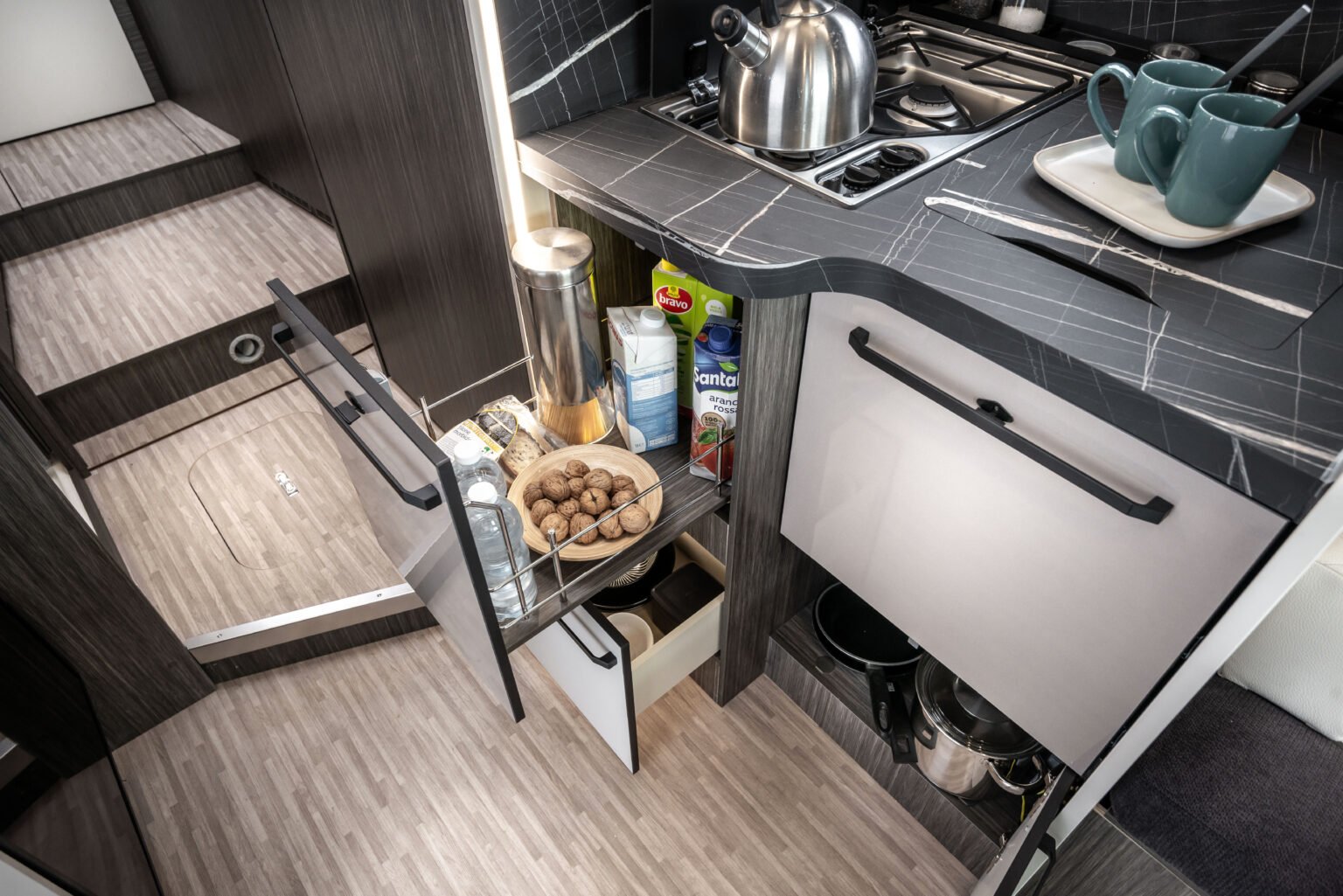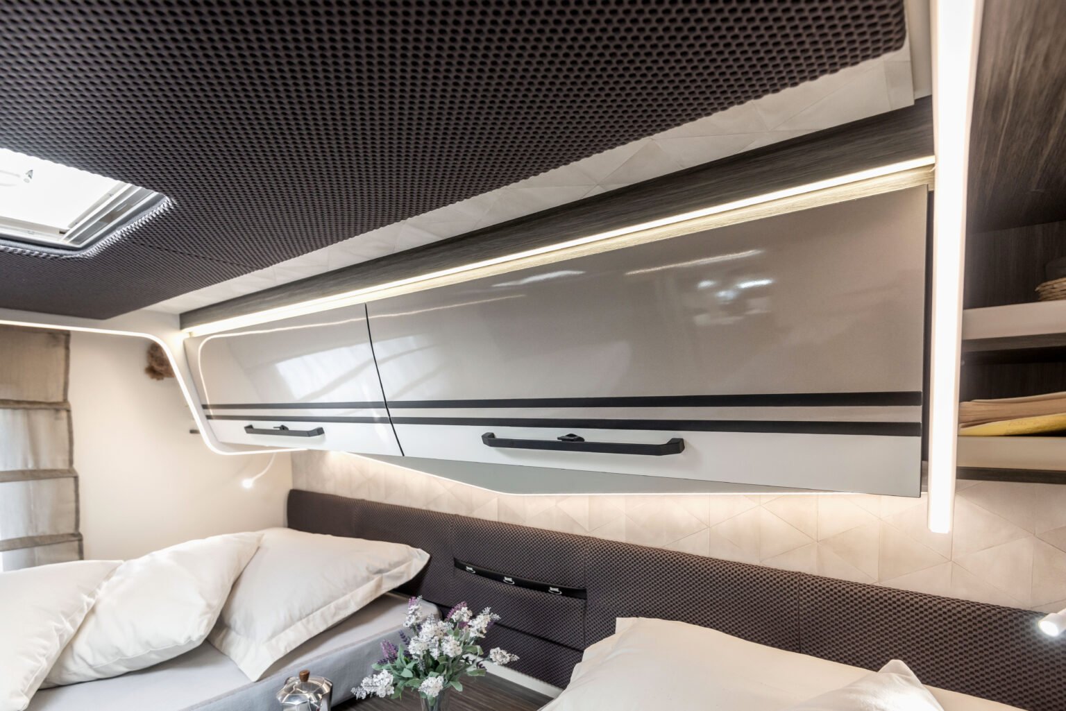 En los modelos con asientos encontrados, los asientos de la zona de comedor se convierten fácilmente en Comfort Seats durante el viaje. Gracias a un sistema práctico e intuitivo, el cojín pasa de reposabrazos a soporte para la cabeza, ofreciendo un mayor confort y ergonomía durante el viaje. La conversión de la zona de descanso en el modo de viaje (y viceversa) es rápida y suave, gracias al nuevo soporte giratorio.
