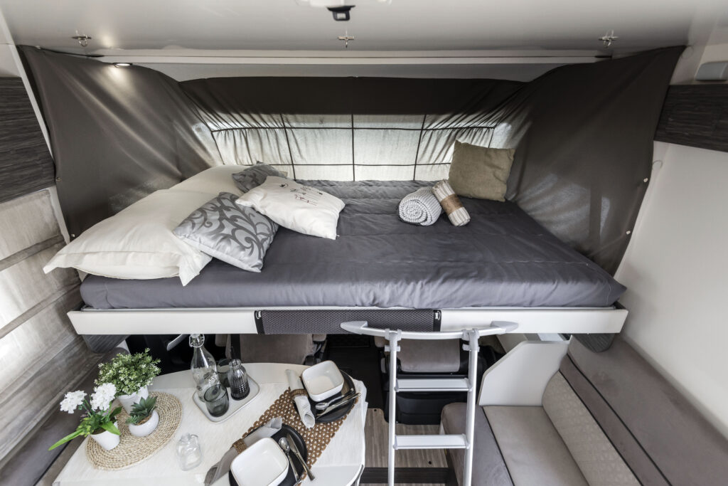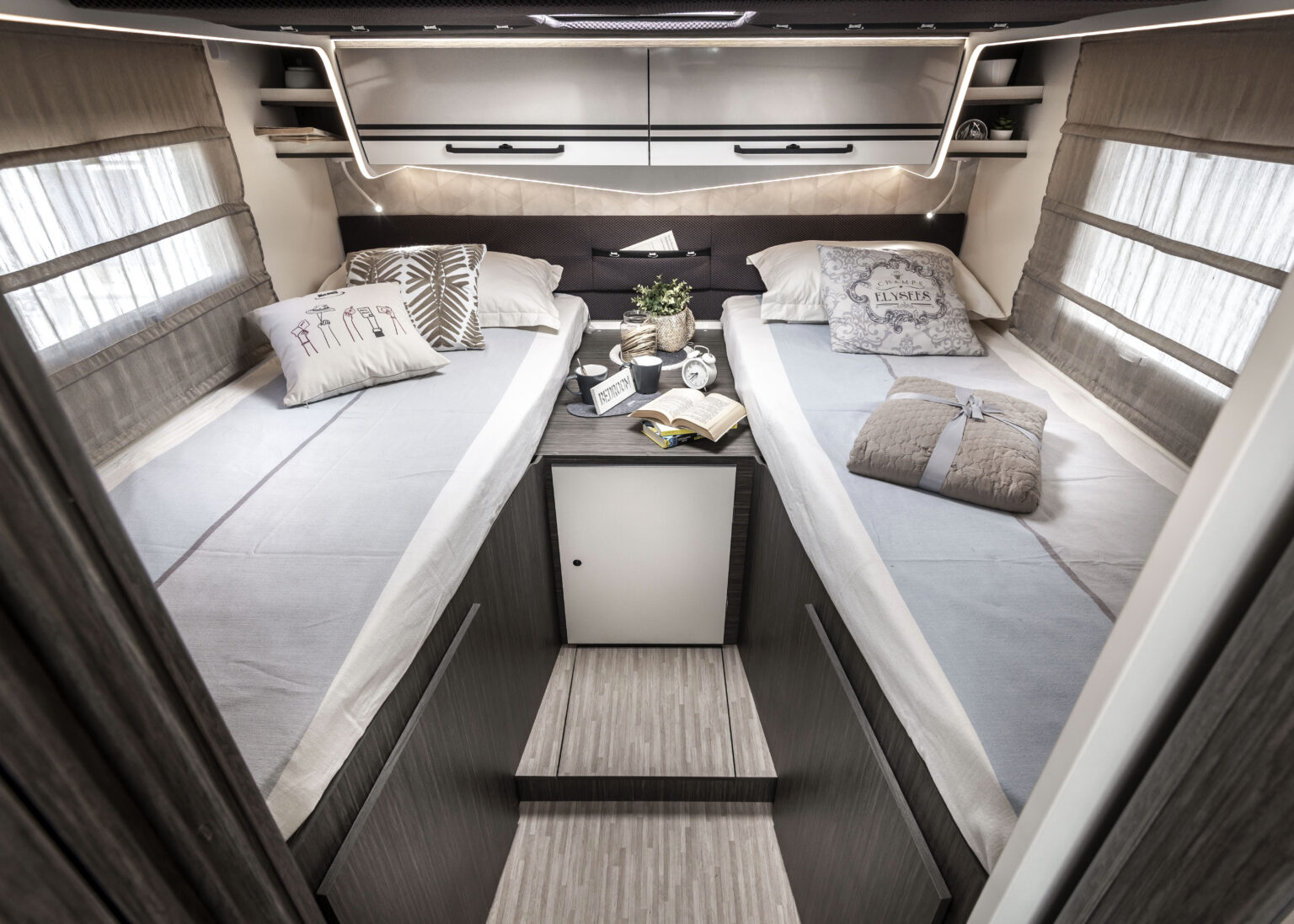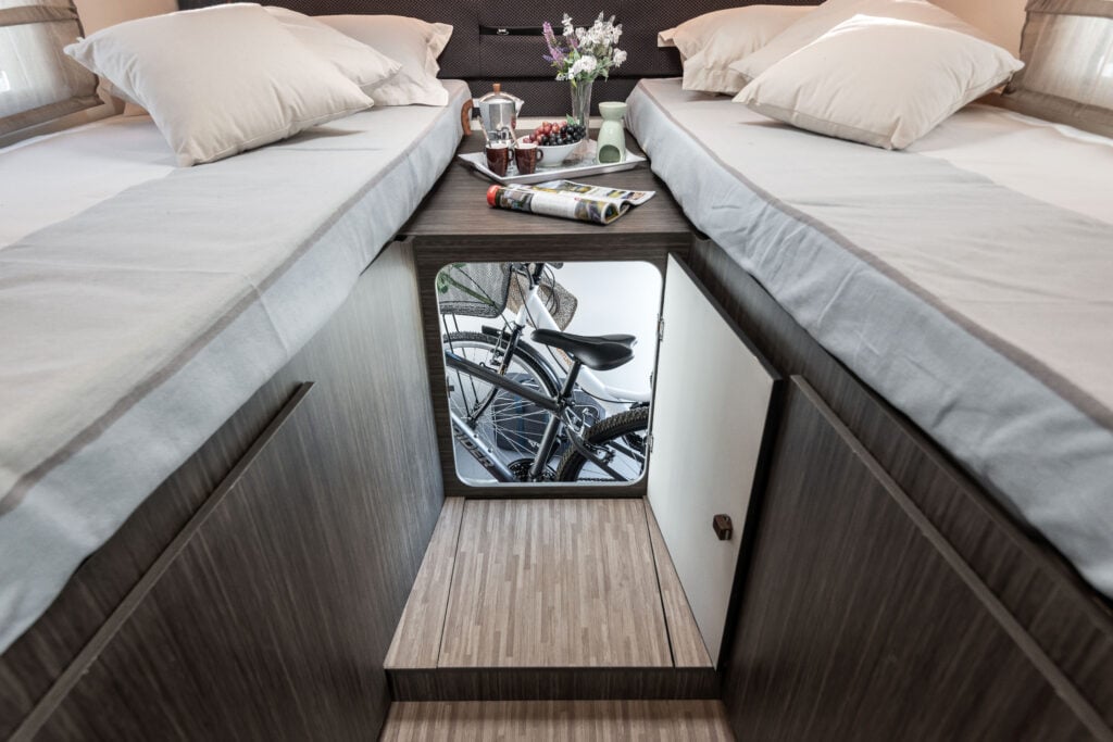 La zona de descanso garantiza comodidad y funcionalidad en un ambiente diseñado para optimizar el espacio y favorecer el relax. Las camas gemelas de 2 metros ofrecen la máxima comodidad, mientras que el espacio de almacenamiento debajo de las lamas elevables permite guardar objetos voluminosos sin reducir el espacio habitable. El práctico acceso al garaje facilita las operaciones de carga y descarga.