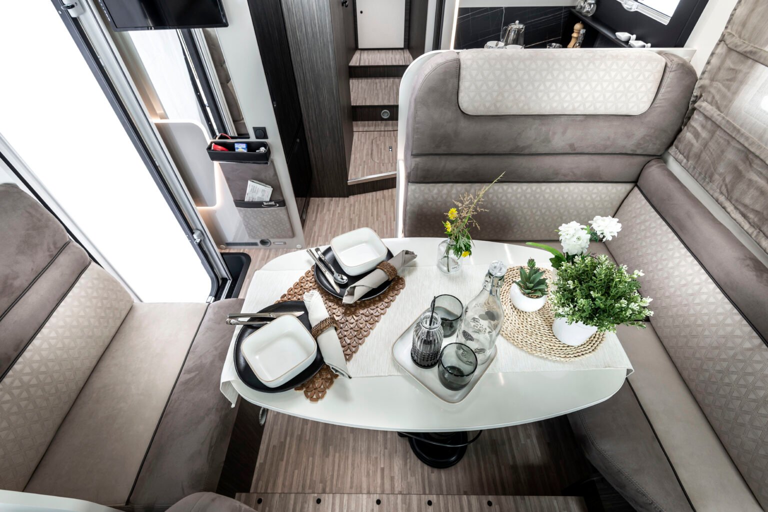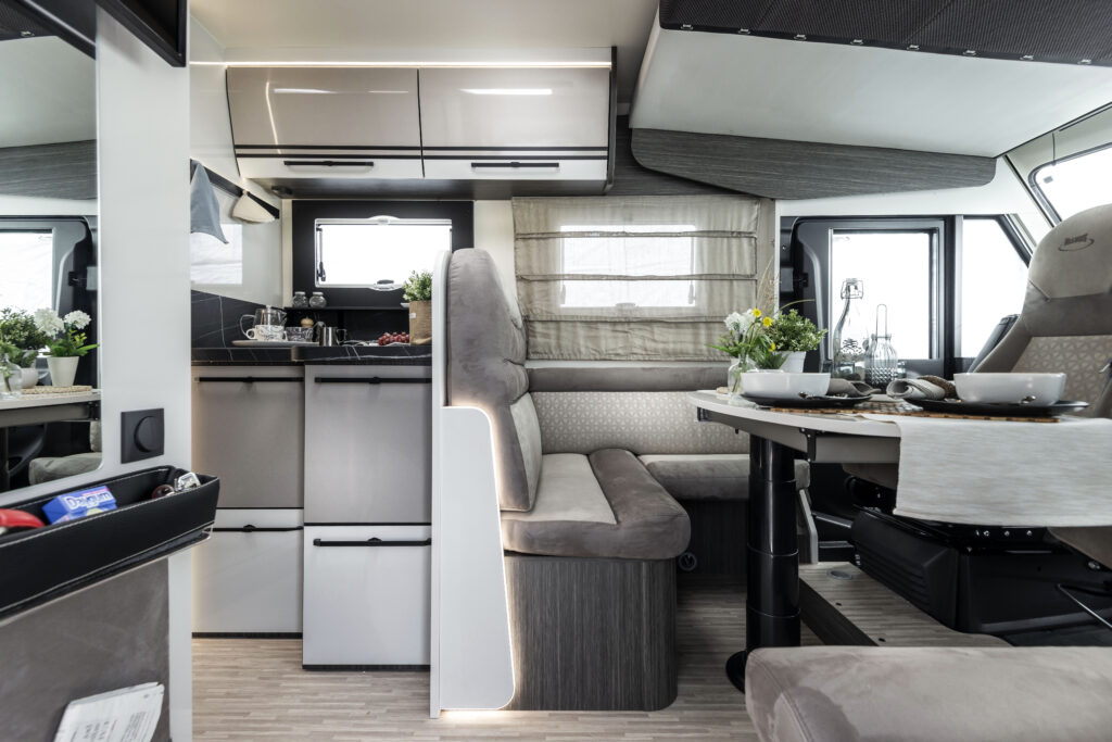 La zona de comedor combina espacio, luz y practicidad, creando un ambiente acogedor y versátil. Ofrece comodidad y libertad de movimiento gracias a los asientos ergonómicos y bien distribuidos. El panel de control iNet X permite gestionar de forma sencilla y centralizada todas las funciones del vehículo, mientras que la puerta rígida que separa la zona de estar de la zona de noche garantiza privacidad y tranquilidad.