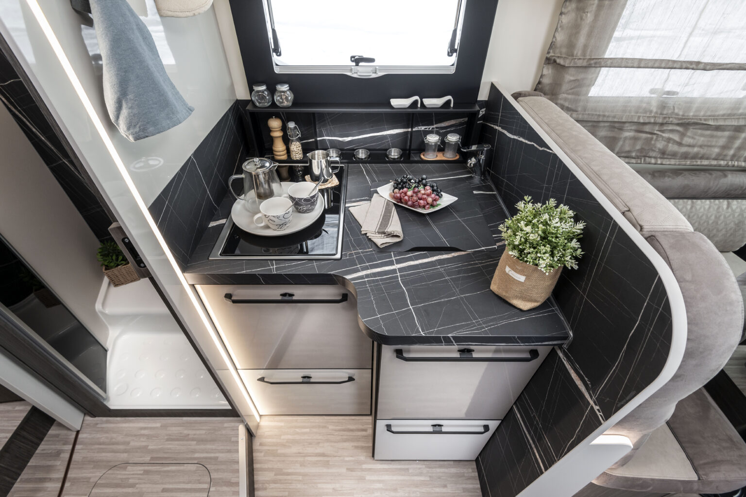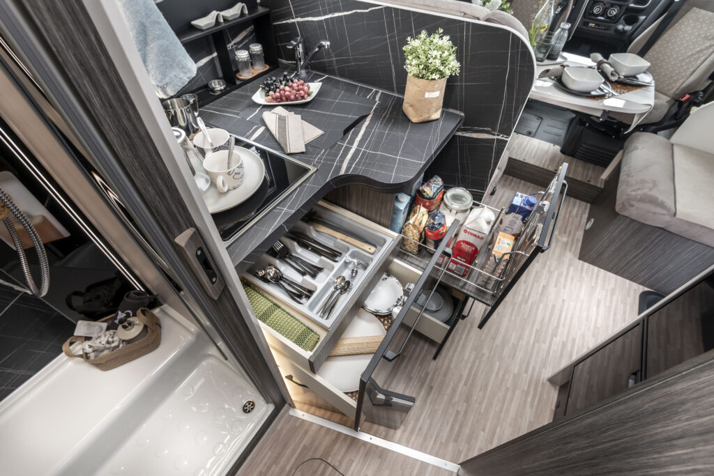 Completan el equipamiento la tapa de fregadero/tabla de cortar, el especiero y los accesorios de pared, para una cocina práctica y ordenada durante el viaje. El amplio frigorífico de compresor de 158 l es ideal para conservar todos los ingredientes.