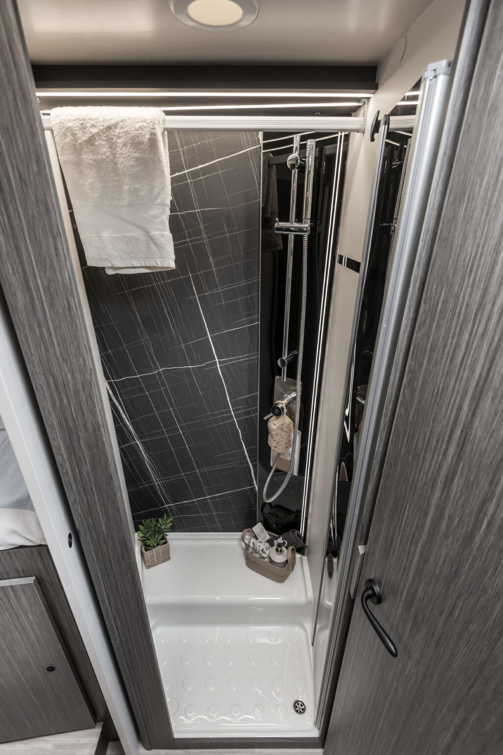 El baño ofrece el máximo confort, funcionalidad y privacidad durante el viaje. La claraboya garantiza la entrada de luz natural y ventilación, mientras que la amplia ducha independiente asegura practicidad y facilidad de uso. El espacio incluye un armario con espejo y una estantería a lo largo de toda la pared con soporte para cepillos de dientes integrado, ideales para mantener todo en orden.