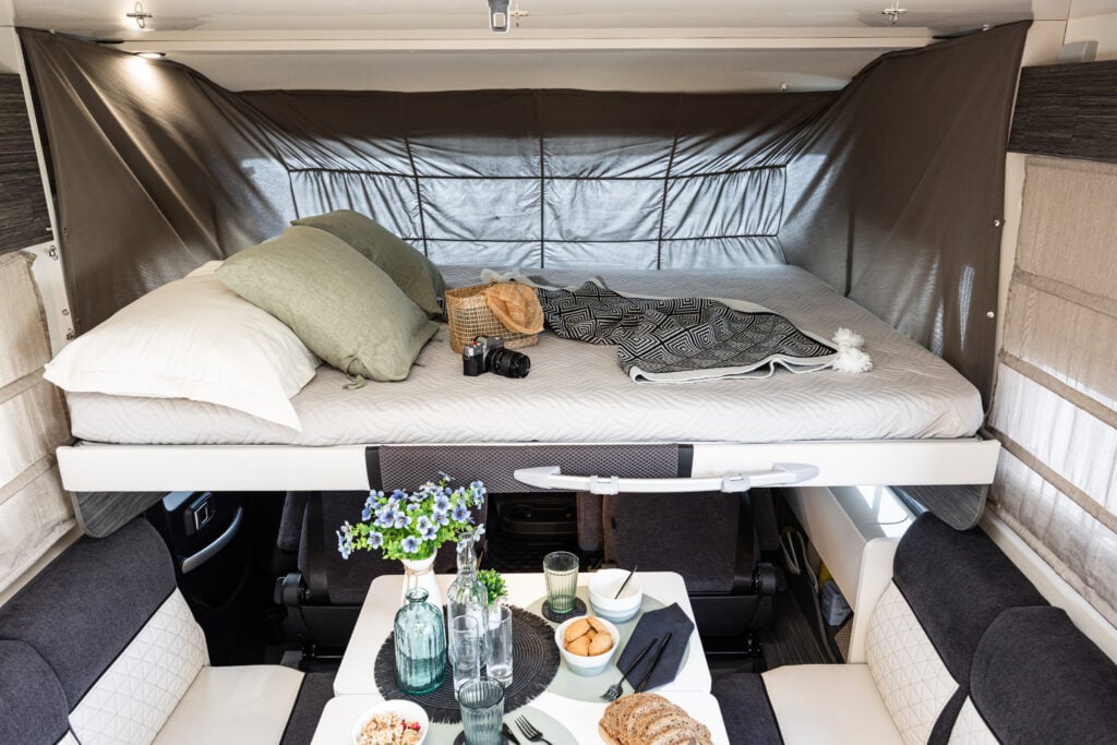 La zona de descanso está diseñada para ofrecer el máximo confort durante la noche, con un amplio espacio para un descanso realmente rejuvenecedor. La cama doble central está equipada de serie con un sistema de elevación eléctrica de serie, para que pueda ajustar fácilmente la altura y crear más espacio en la zona de descanso o en el garaje, según sus necesidades. Los amplios compartimentos portaobjetos integrados en los escalones facilitan la organización, haciendo que cada detalle sea práctico y funcional.