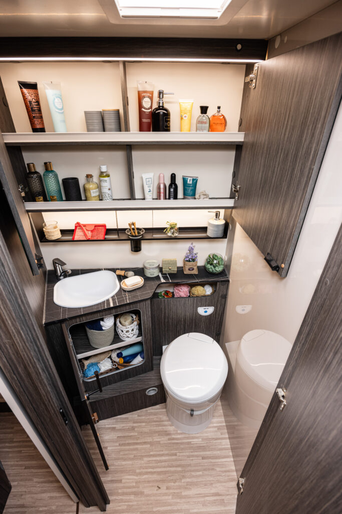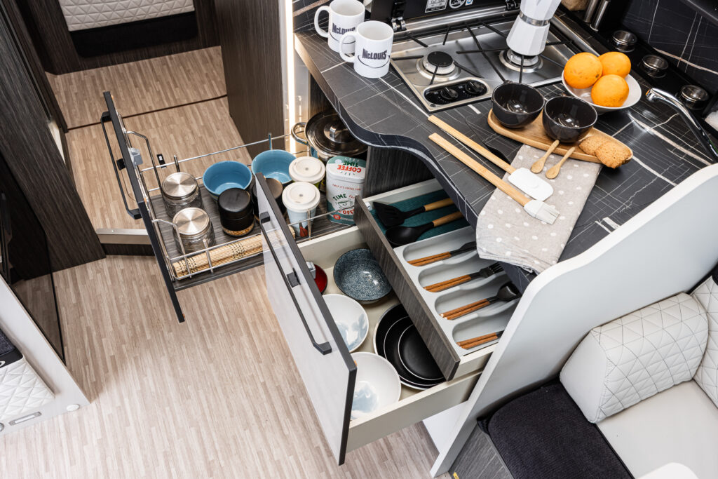 La cocina combina estilo y funcionalidad en un ambiente cuidado y perfectamente organizado. La placa de cocción con 2 fogones premium y el fregadero con desagüe invisible y porta esponjas integrado garantizan practicidad y comodidad durante el viaje. Los amplios compartimentos de almacenamiento, que incluyen armarios con estantes, cestos con cierre suave y cajones internos, permiten mantener los utensilios y las provisiones siempre ordenados.
