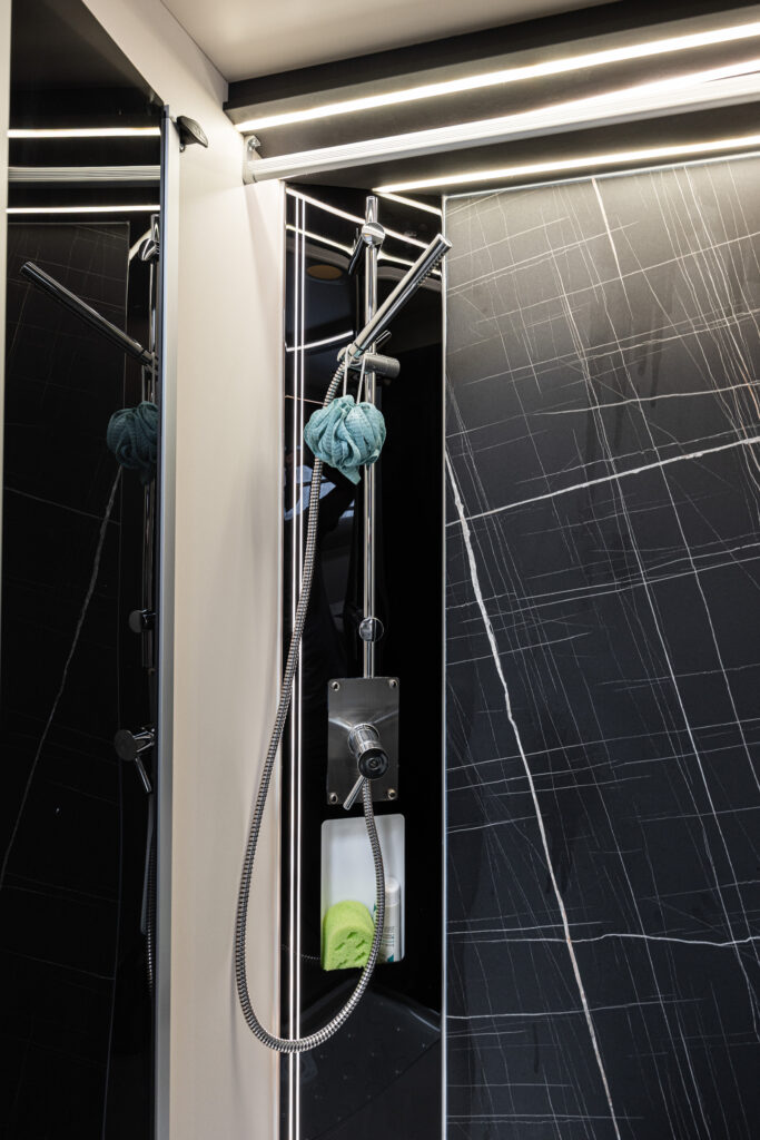 El espacio se completa con un armario con espejo, estante para objetos de todo el largo y soporte para cepillos de dientes integrado, ideal para organizar mejor los productos y accesorios. La puerta del baño, que puede utilizarse como separación entre la zona de estar y la zona de descanso, permite crear espacios diferenciados y privados, aumentando el confort a bordo.