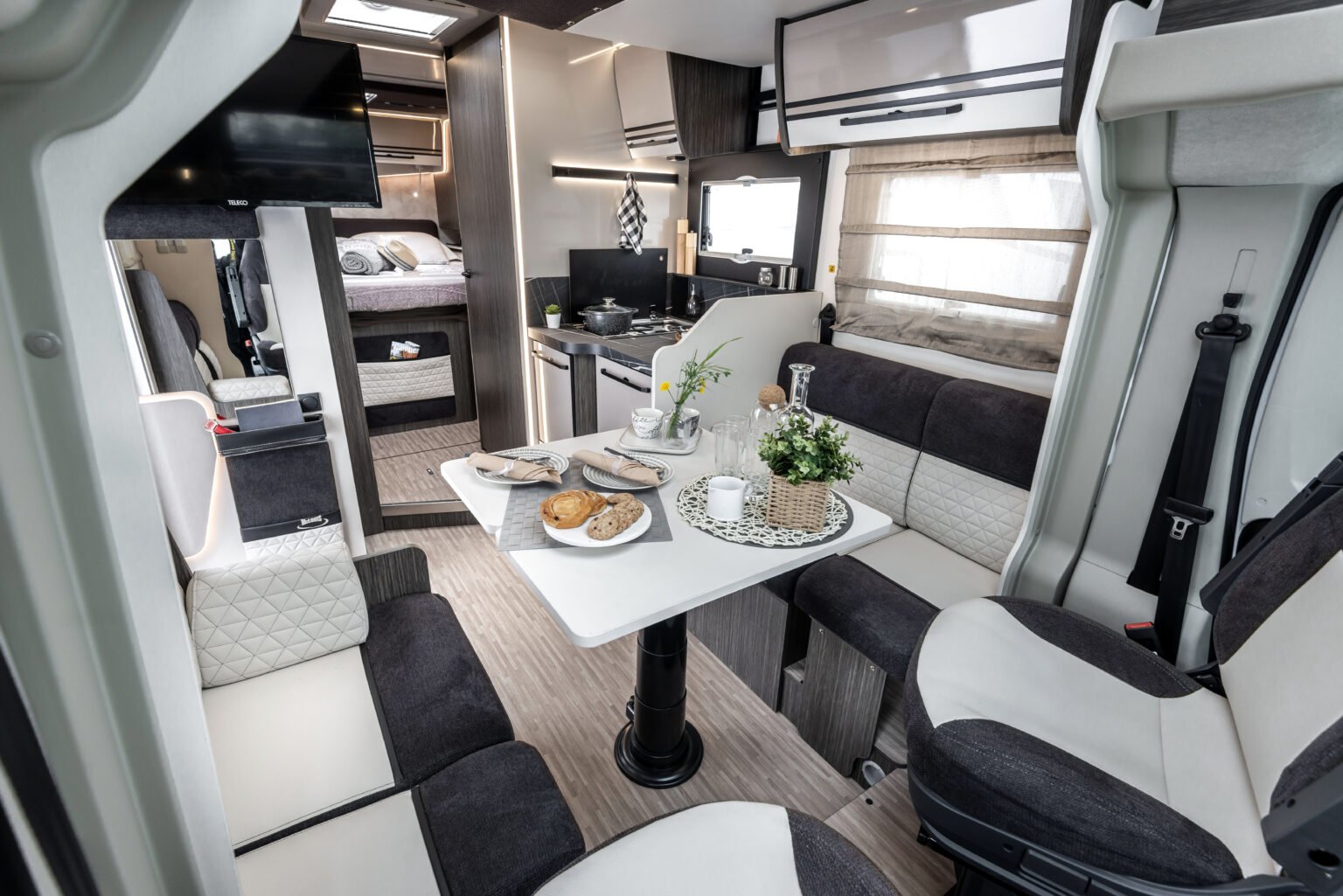 La zona de comedor cara a cara ofrece un ambiente espacioso y luminoso, pensado para el relax y la convivencia. Los asientos ergonómicos, amplios y bien distribuidos, garantizan comodidad y libertad de movimiento en todo momento del día. La mesa plegable de laminado brillante con pata antracita, desplazable y giratoria en 360°, combina elegancia y funcionalidad, ofreciendo la máxima practicidad tanto durante las comidas como en las actividades diarias.