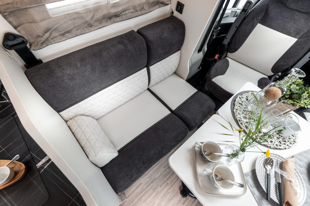 En los modelos con asientos encontrados, los asientos de la zona de comedor se convierten fácilmente en Comfort Seats durante el viaje. Gracias a un sistema práctico e intuitivo, el cojín pasa de reposabrazos a soporte para la cabeza, ofreciendo un mayor confort y ergonomía durante el viaje. La conversión de la zona de descanso en el modo de viaje (y viceversa) es rápida y suave, gracias al nuevo soporte giratorio.