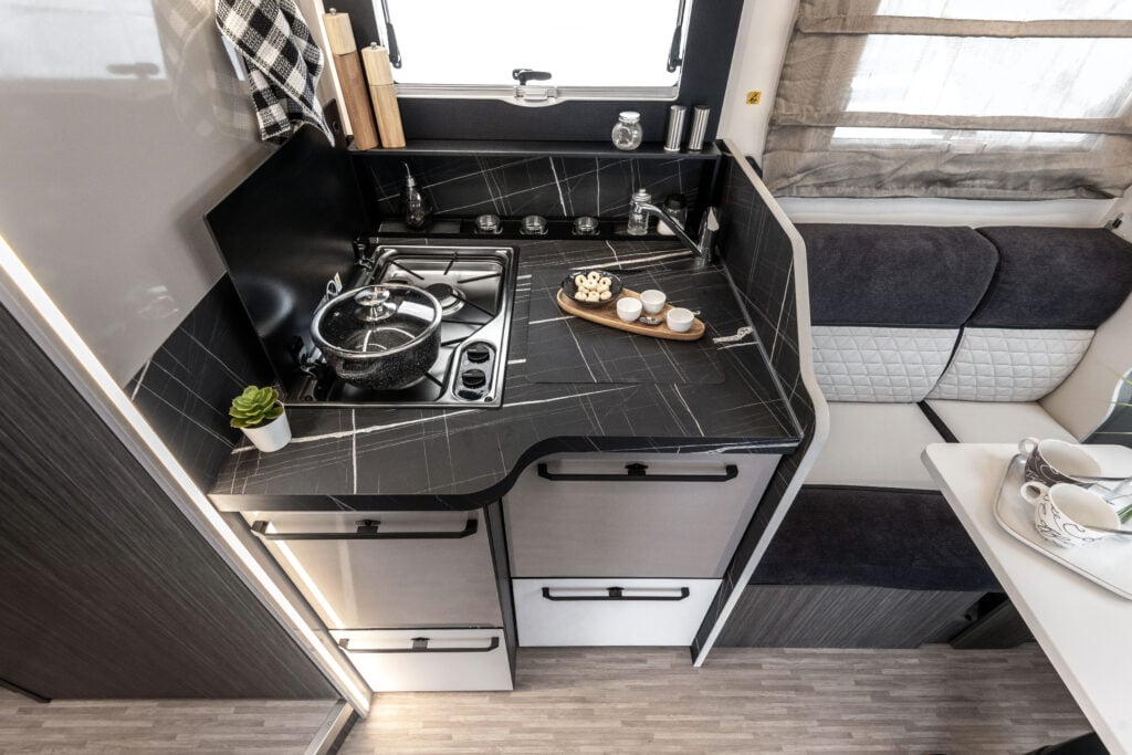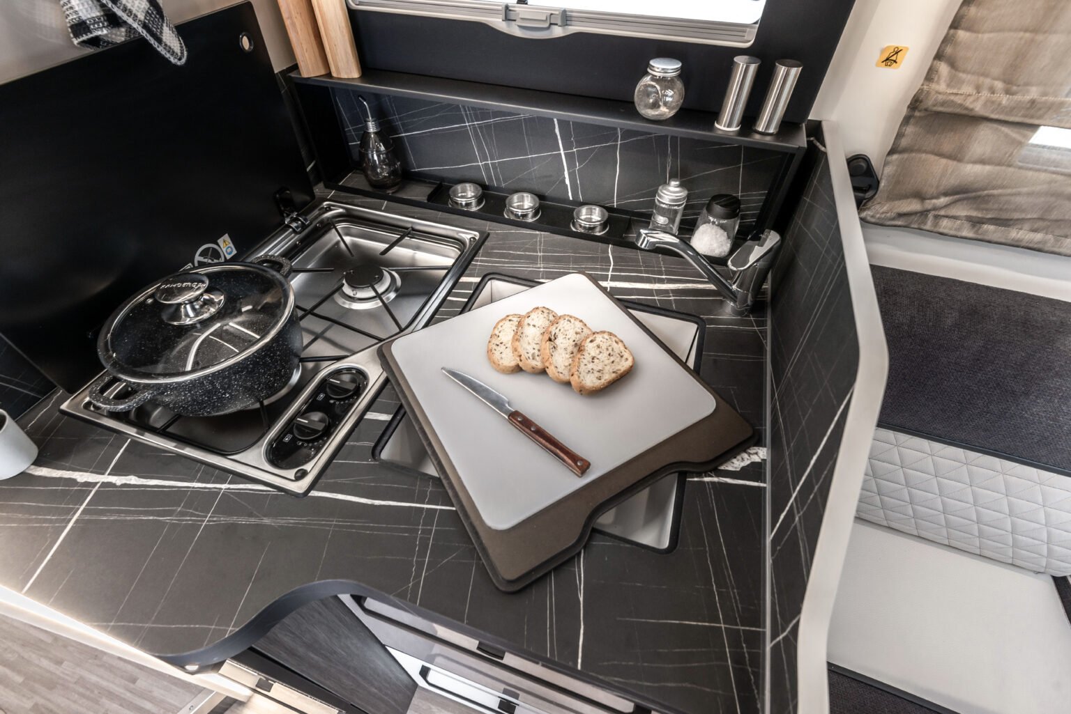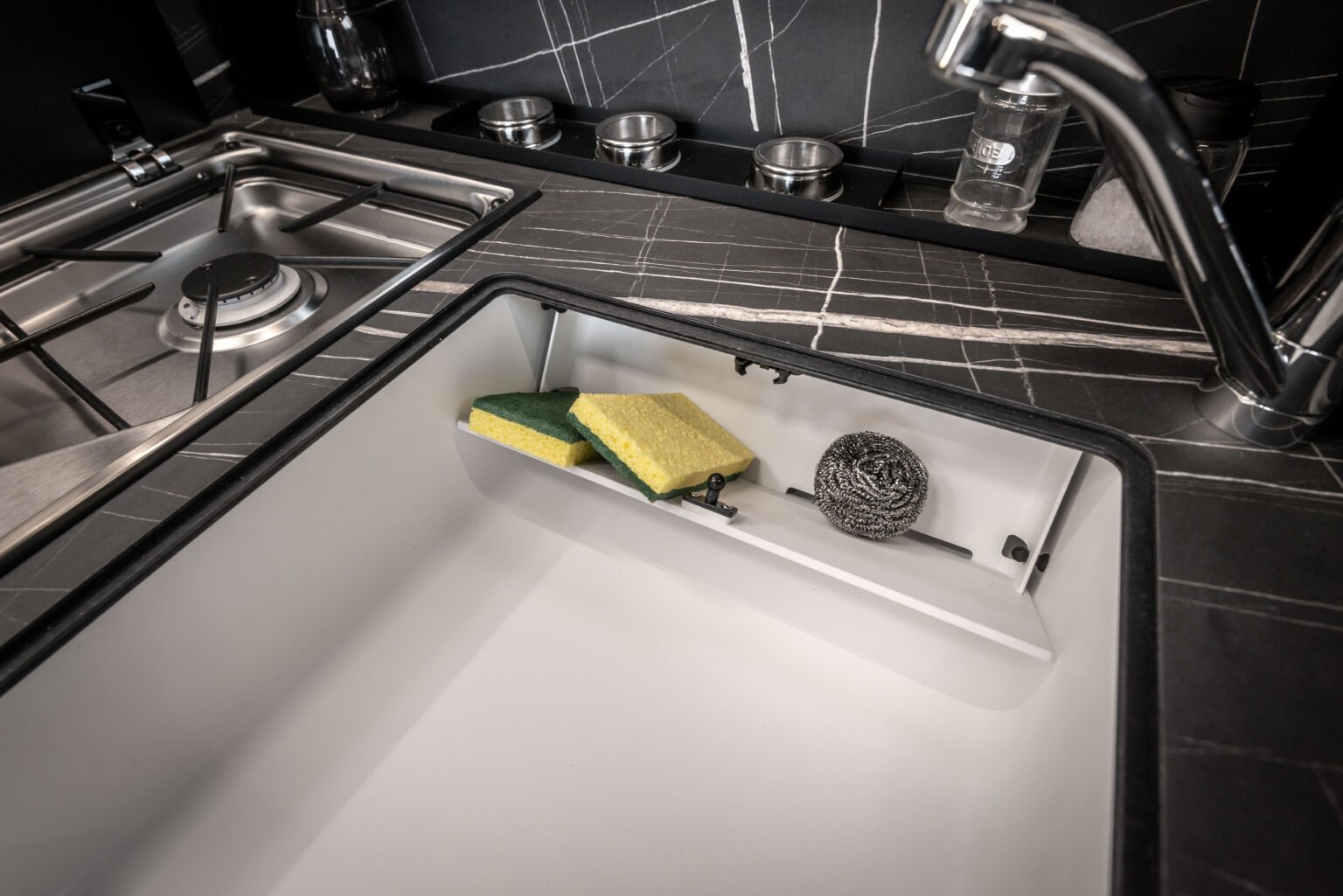 La cocina combina estilo y funcionalidad en un ambiente cuidado y perfectamente organizado. La placa de cocción con 2 fogones premium y el fregadero con desagüe invisible y porta esponjas integrado garantizan practicidad y comodidad durante el viaje. Los amplios compartimentos de almacenamiento, que incluyen armarios con estantes, cestos con cierre suave y cajones internos, permiten mantener los utensilios y las provisiones siempre ordenados.