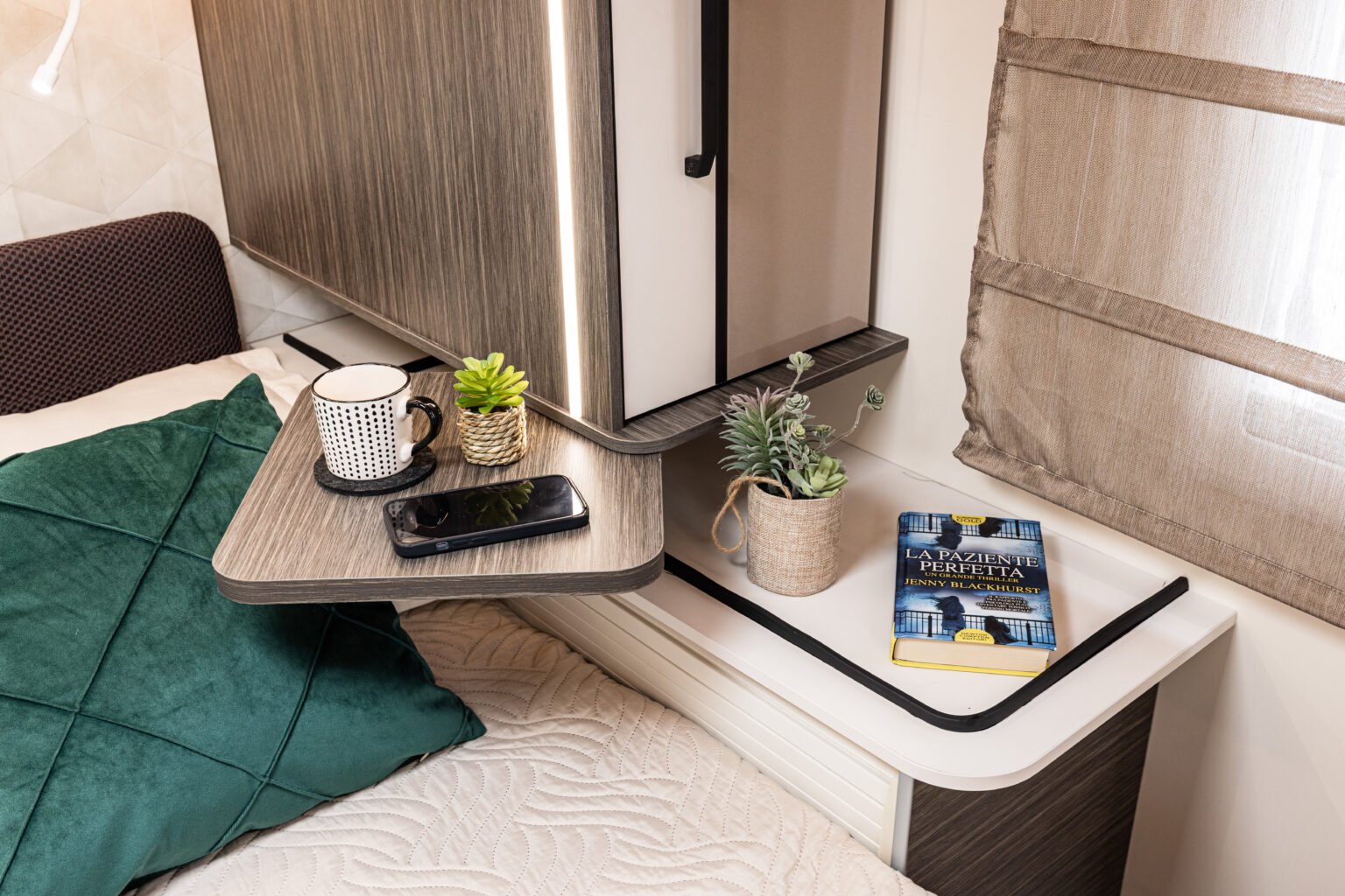 Sur les modèles face à face, les sièges de la dînette se transforment facilement en sièges confort pendant le voyage. Grâce à un système pratique et intuitif, le coussin se transforme d’accoudoir en support pour la tête, offrant plus de confort et d’ergonomie lors des déplacements. Le passage du mode repos au mode voyage (et vice versa) se fait rapidement, grâce au nouveau support rotatif pratique.