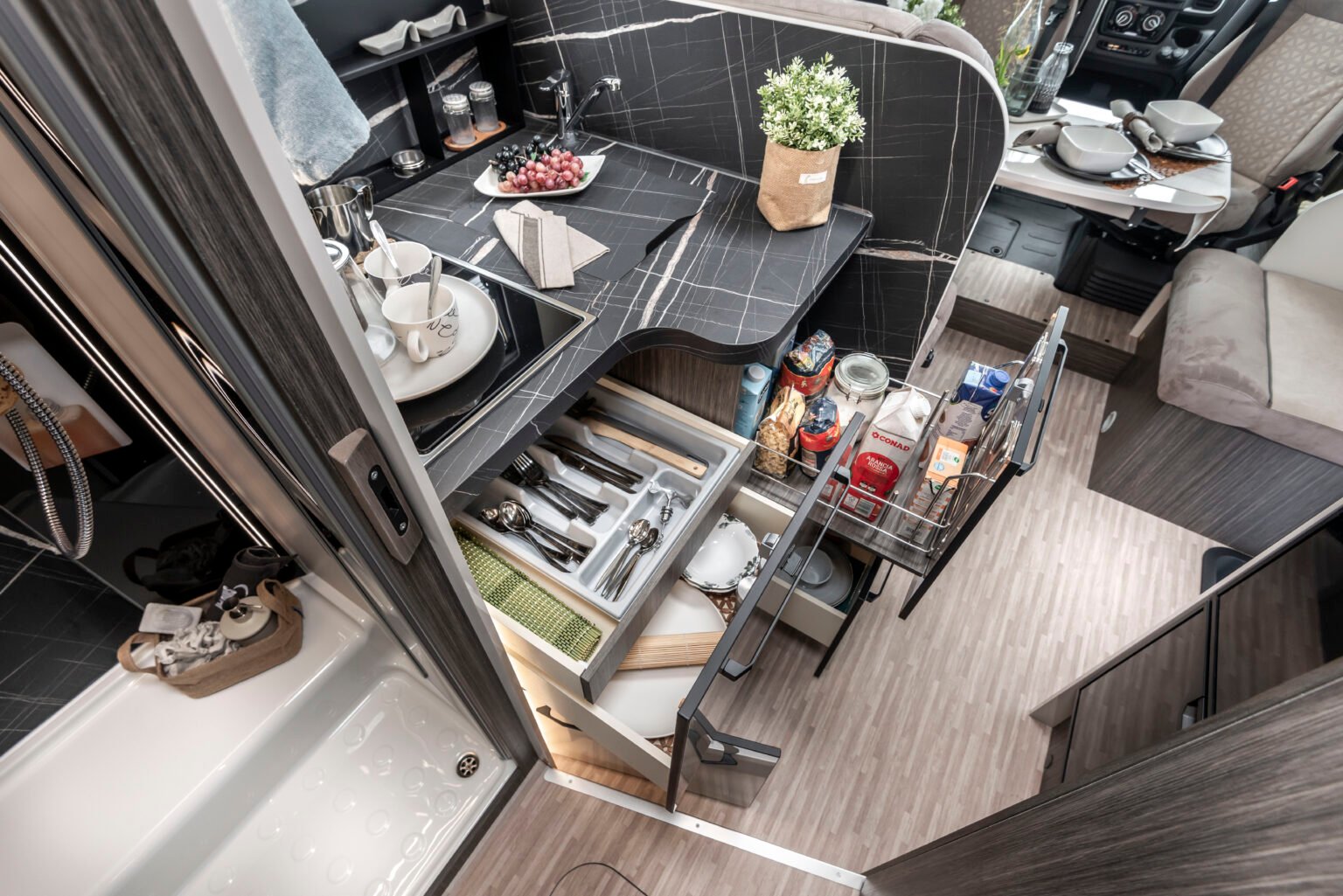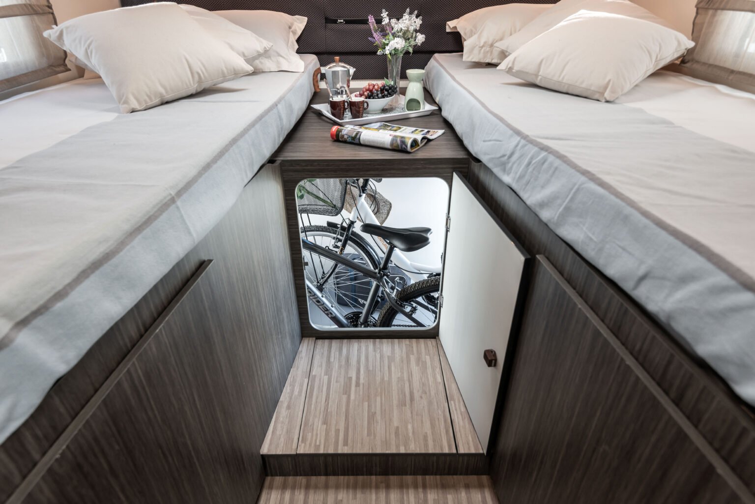 Une grande attention est accordée à la fonctionnalité et à l’utilisation pratique au quotidien : le réglage électrique de la hauteur sur les modèles à lit central et à lit garage vous permet d’ajuster la hauteur du lit pour gagner de l’espace dans la chambre ou le garage, en fonction de vos besoins. Le garage XXL vous permet d’emporter tout ce dont vous avez besoin. Éclairé et chauffé, il est également équipé d’une prise 220 V, idéale pour alimenter des appareils électriques ou recharger votre équipement pendant le voyage.