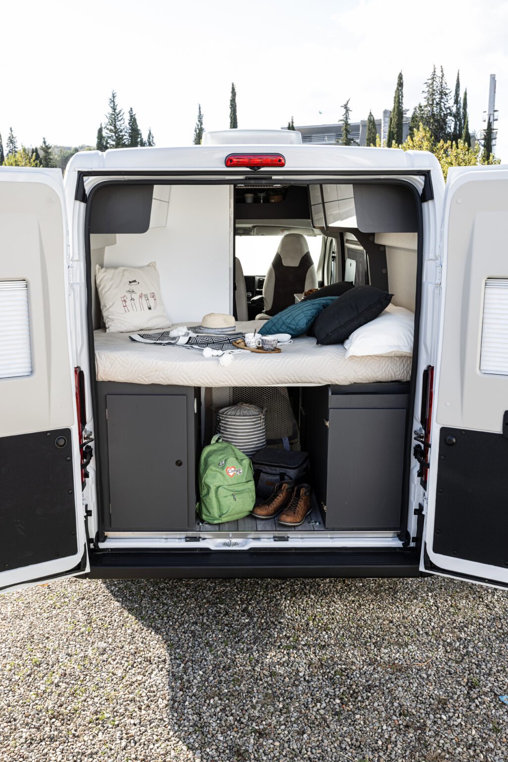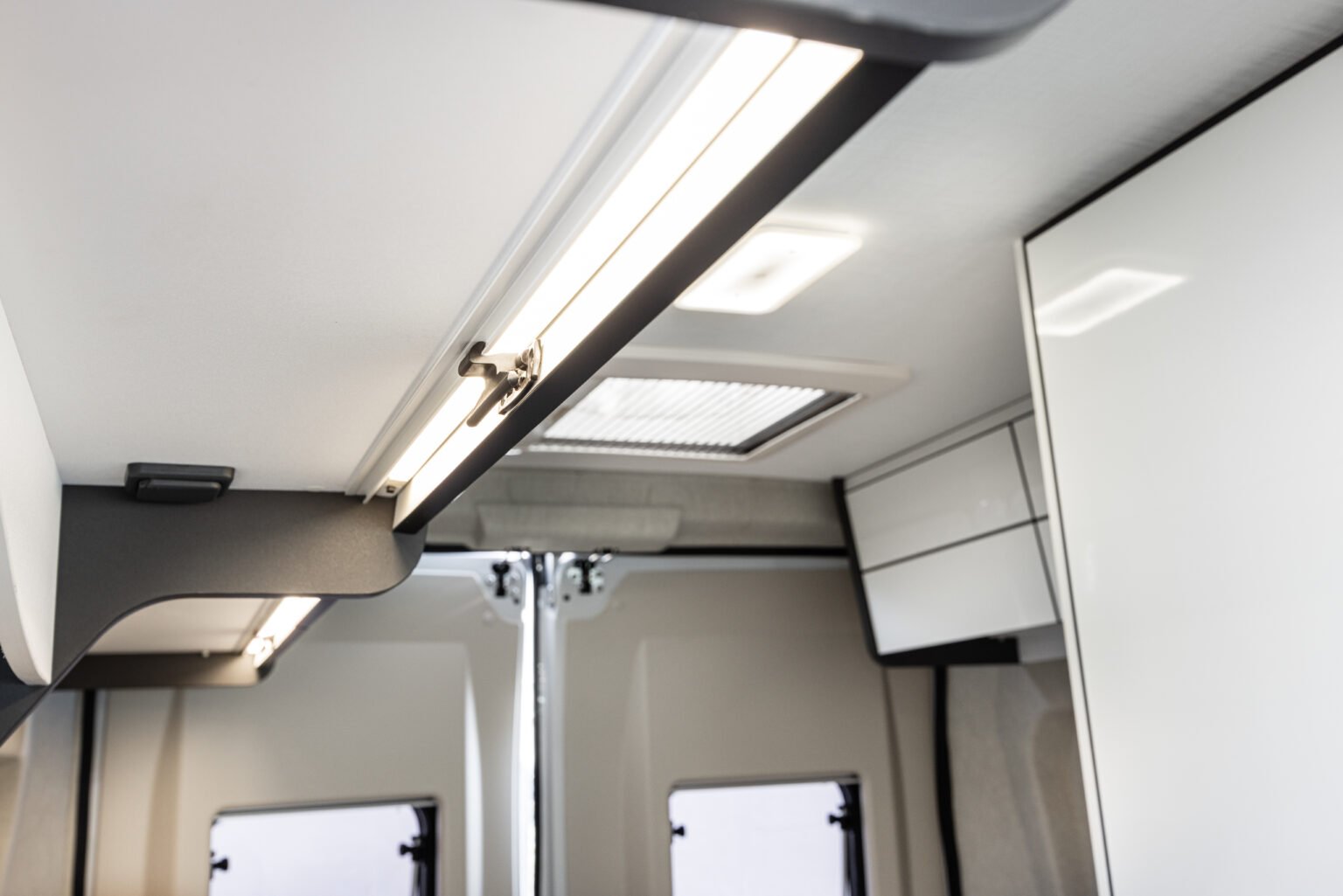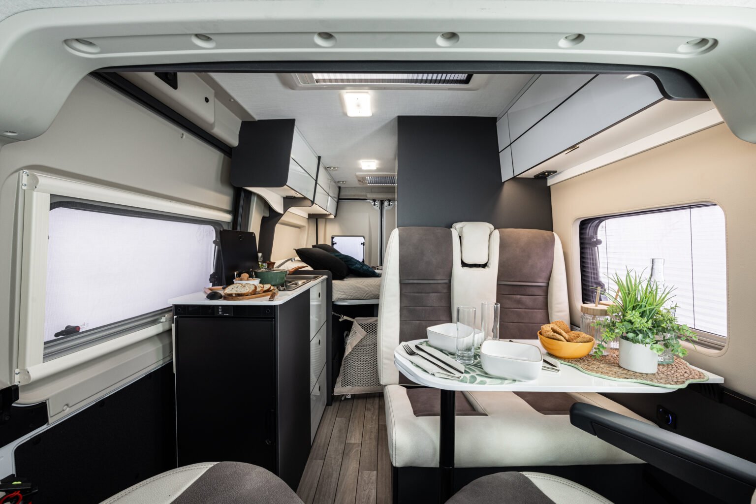 Le fourgon le plus compact de la gamme. Avec un lit double à l’arrière, une salle de bains compacte avec douche intégrée et un réfrigérateur à compression de 84 litres.