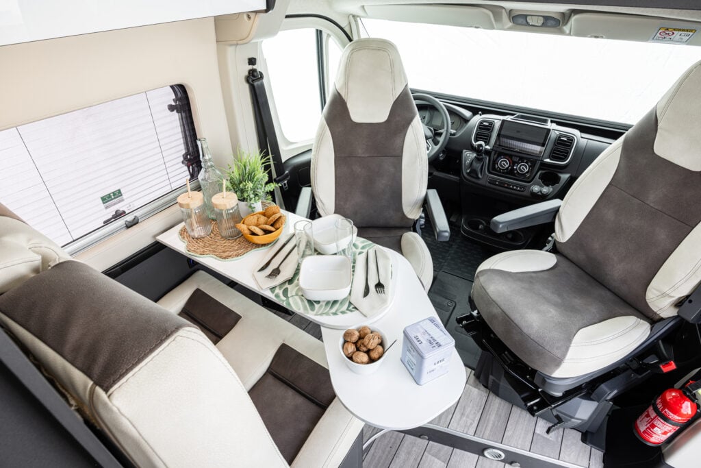 La cuisine linéaire est équipée d’une plaque de cuisson à deux feux et d’un évier en acier. Elle offre un grand espace de rangement avec 3 tiroirs et un grand placard avec éclairage LED tactile intégré. Le réfrigérateur à compresseur de 84 litres, qui peut être ouvert à 180°, est idéal pour les repas en plein air.
