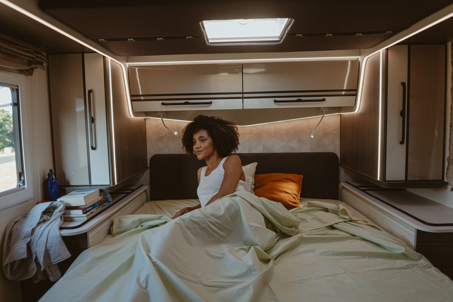 Les modéles avec lits centraux sont équipés de grandes armoires suspendues avec tablettes rotatives et des tables de chevet avec rebords de maintien pour une gestion optimale de l’espace. Dans les modèles avec lits jumeaux et lits garage, l’accès direct à la soute par la cellule est disponible pour plus de commodité.