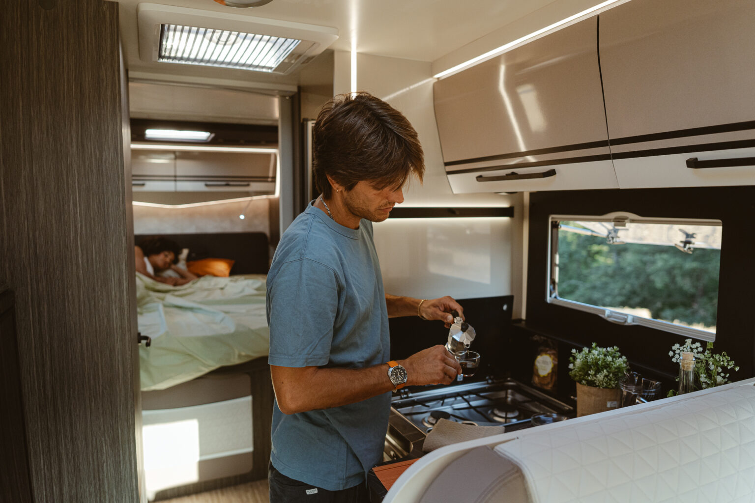 La cuisine de la série 800 est idéale pour mettre vos talents à l’épreuve, grâce à son pland de cuisson premium à 2 feux, ses vastes plans de travail et son grand réfrigérateur à compression de 158 l. Équipée d’un évier avec bonde invisible et porte-éponge intégré, d’un couvercle d’évier pouvant servir de planche à découper, d’un accessoire LED mural et d’un porte-épices pratique ouvert avec étagère supplémentaire, elle est parfaite pour ceux qui recherchent la qualité, la praticité et le design dans un camping-car.