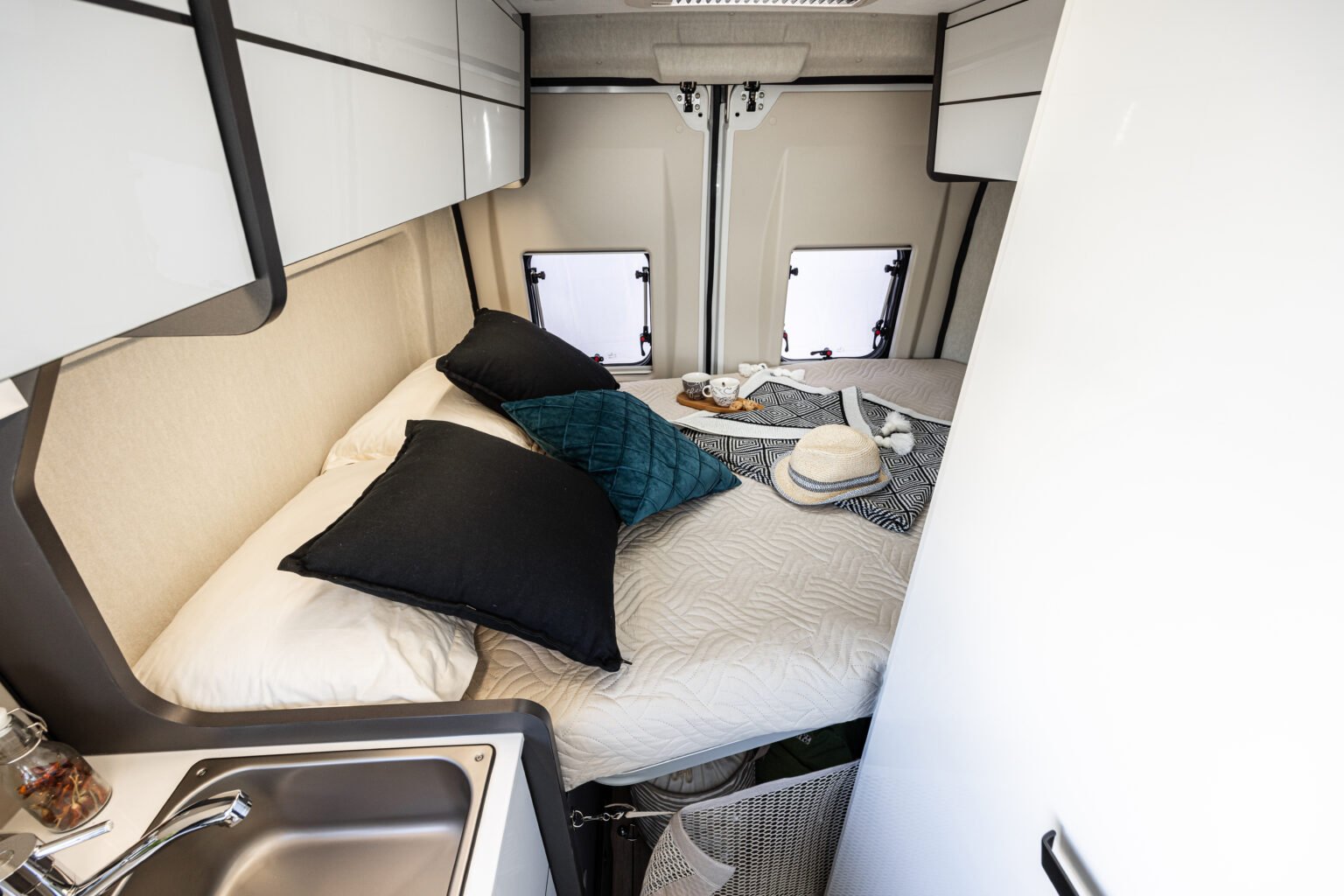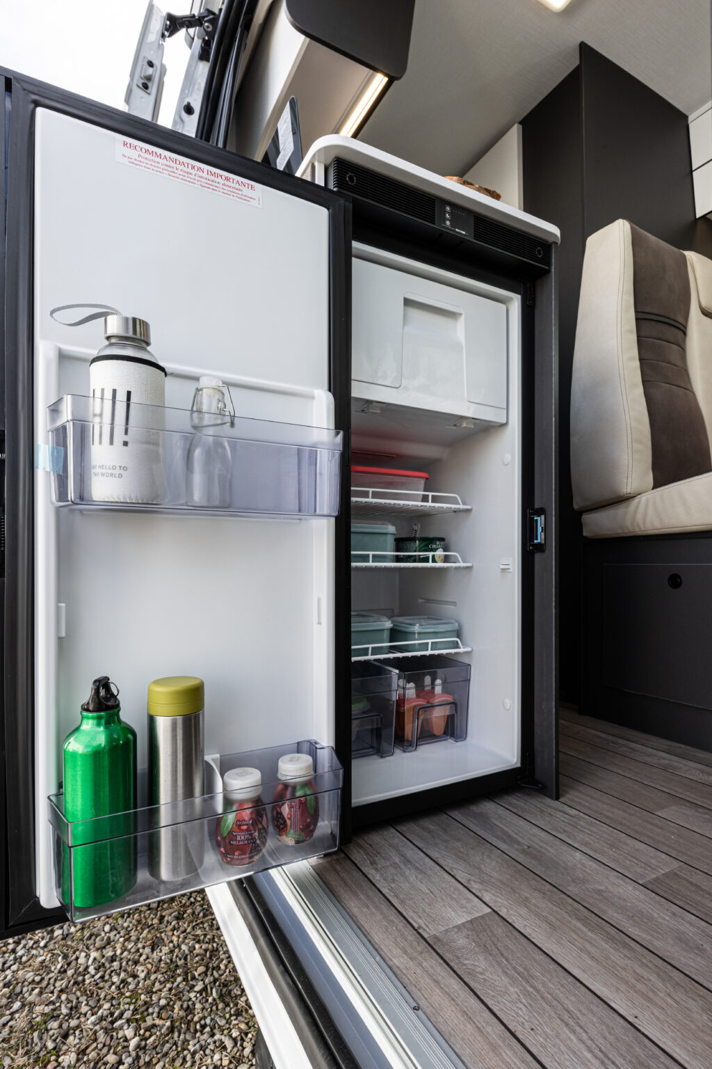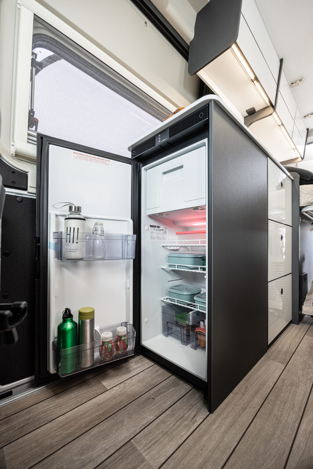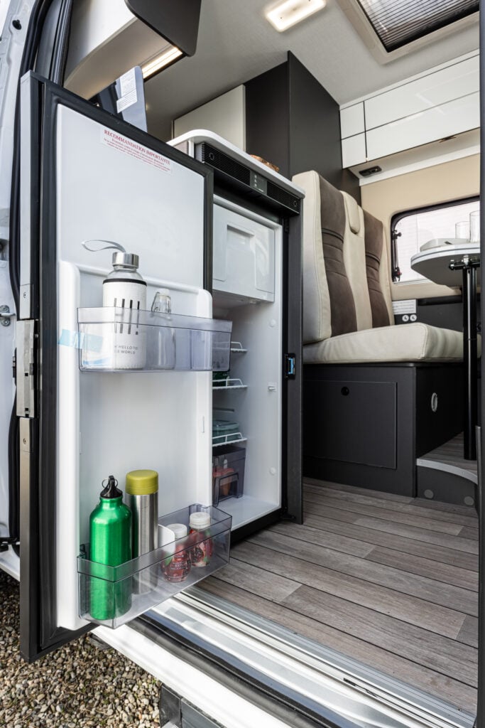 Le fourgon le plus compact de la gamme. Avec un lit double à l’arrière, une salle de bains compacte avec douche intégrée et un réfrigérateur à compression de 84 litres.