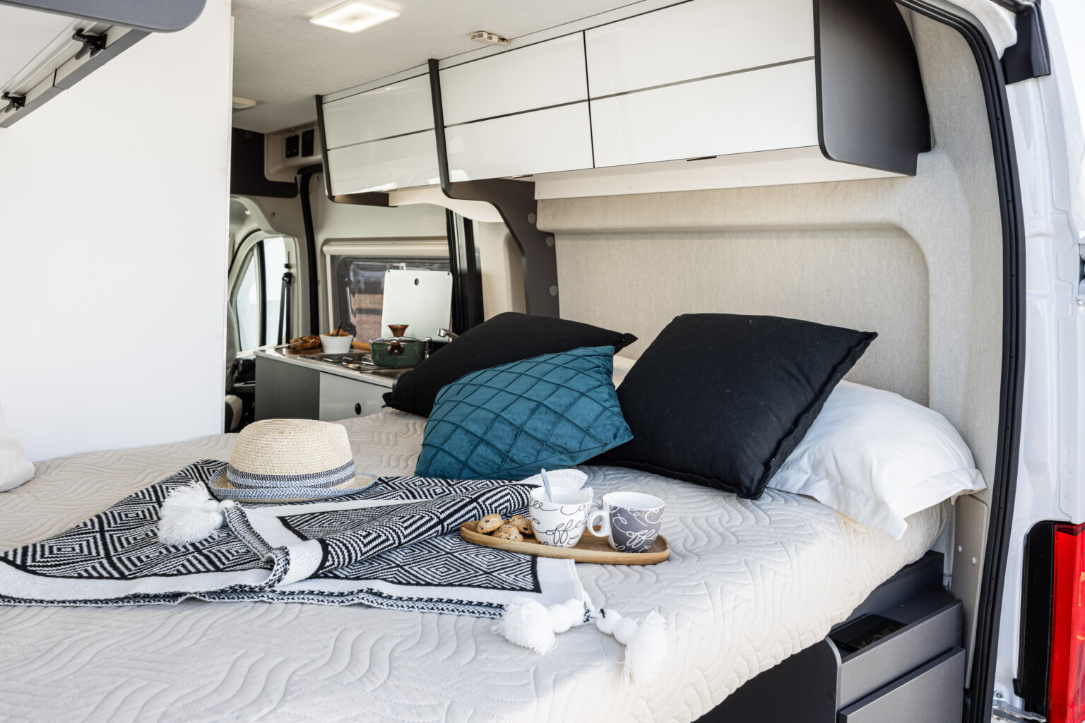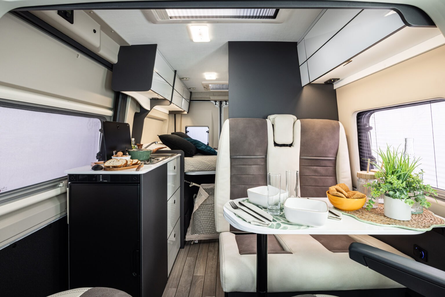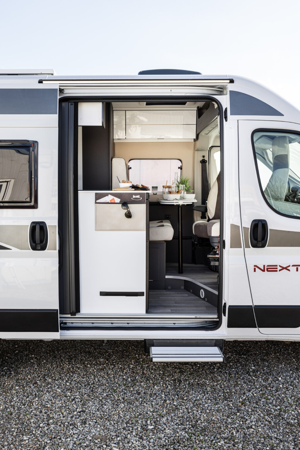 Le fourgon le plus compact de la gamme. Avec un lit double à l’arrière, une salle de bains compacte avec douche intégrée et un réfrigérateur à compression de 84 litres.