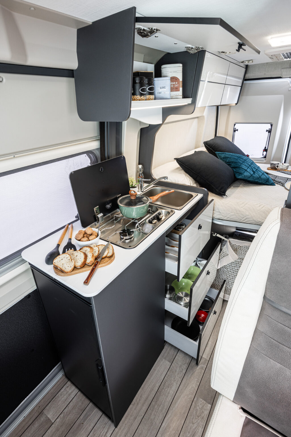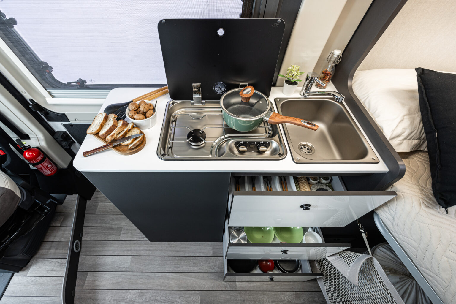 La cuisine linéaire est équipée d’une plaque de cuisson à deux feux et d’un évier en acier. Elle offre un grand espace de rangement avec 3 tiroirs et un grand placard avec éclairage LED tactile intégré. Le réfrigérateur à compresseur de 84 litres, qui peut être ouvert à 180°, est idéal pour les repas en plein air.