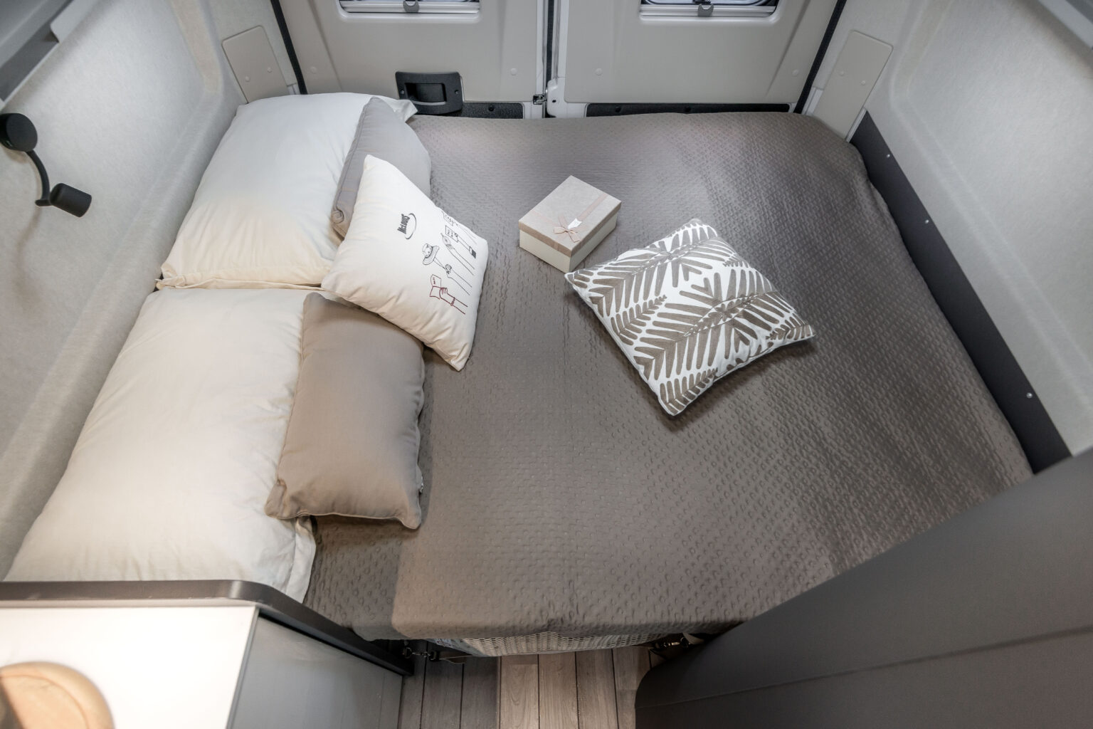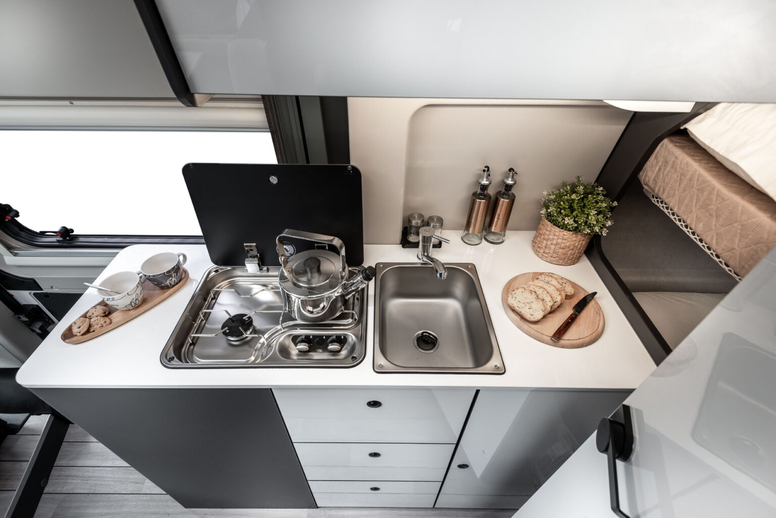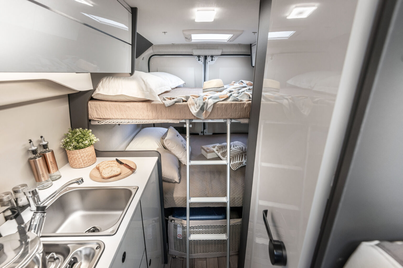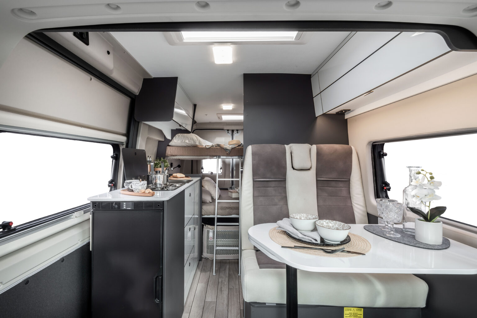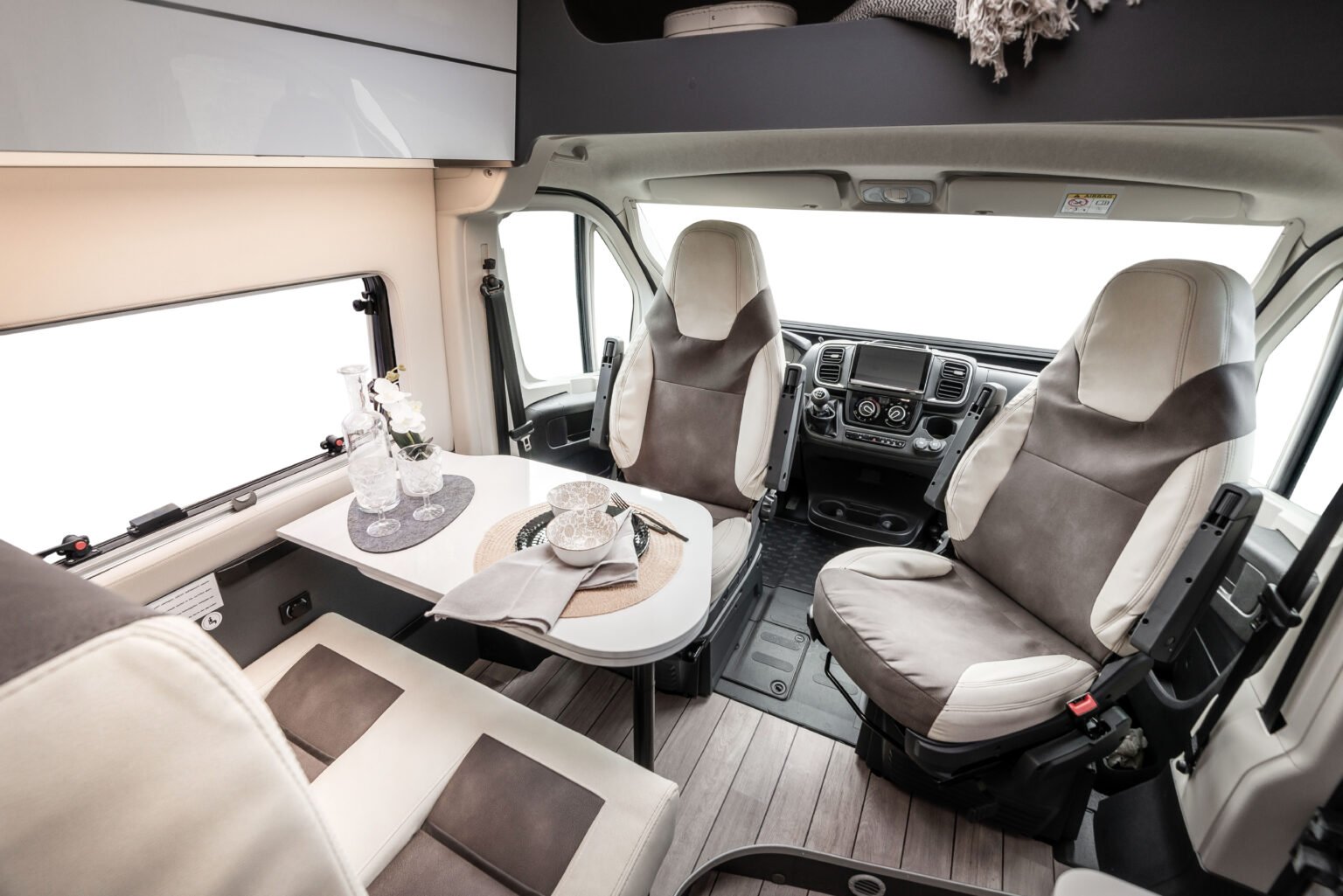 La zone jour se distingue par son design linéaire et moderne, rehaussé par une nouvelle sellerie inspirée du monde de l’automobile, en phase avec les tendances actuelles. La table ergonomique avec extension offre une grande polyvalence, idéale pour manger ou travailler à l’intérieur comme à l’extérieur du véhicule. L’espace est complété par des solutions d’organisation intelligentes : un placard, un compartiment supérieur et des porte-gobelets pratiques rendent chaque voyage encore plus confortable et ordonné.