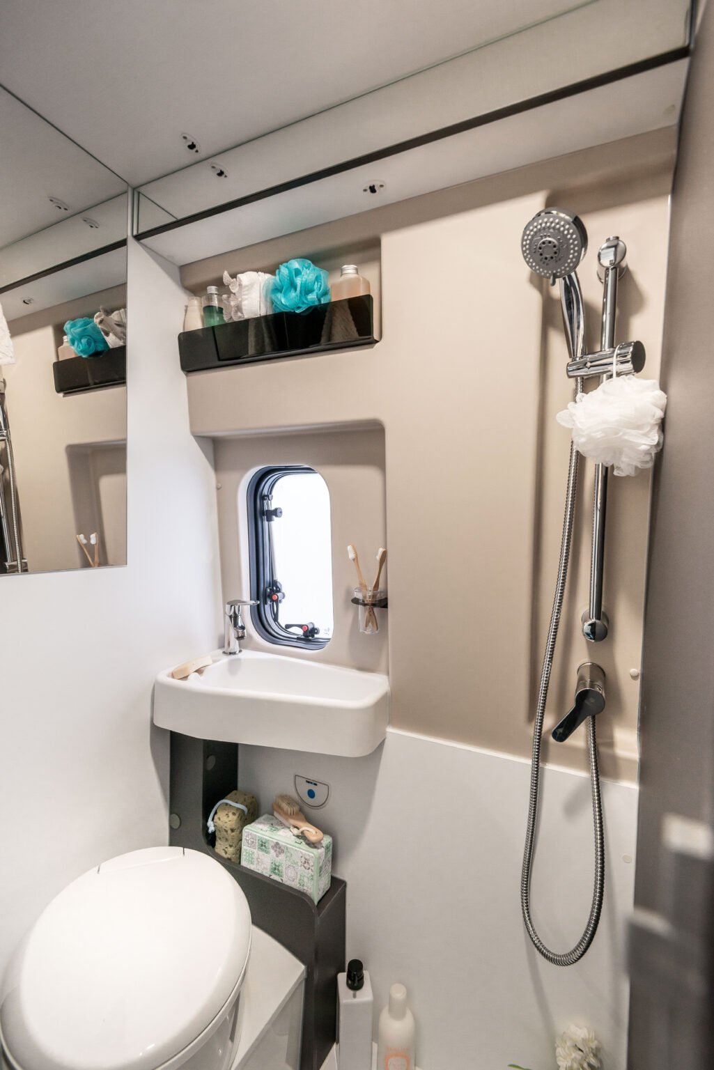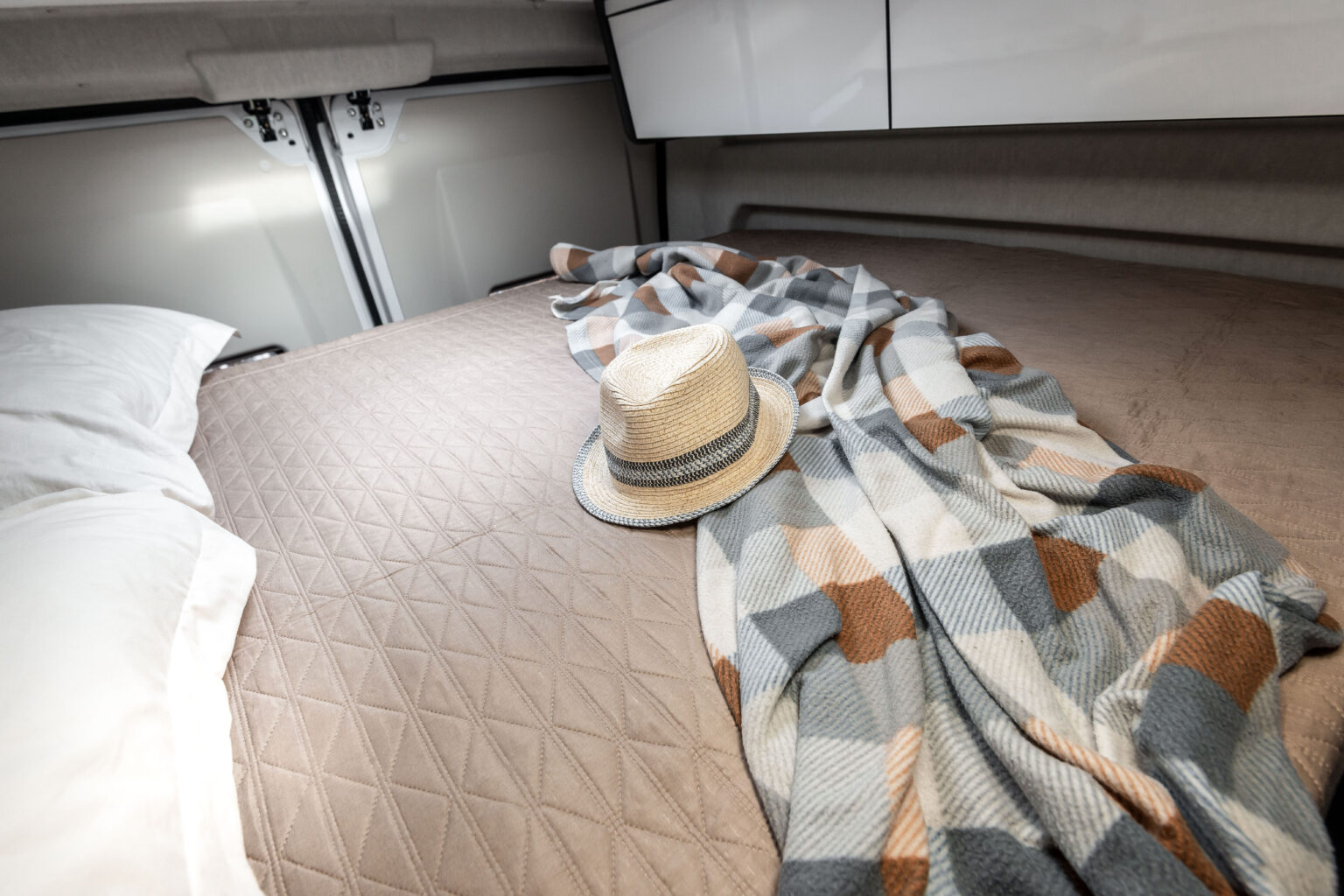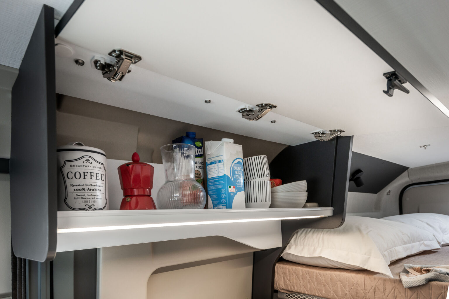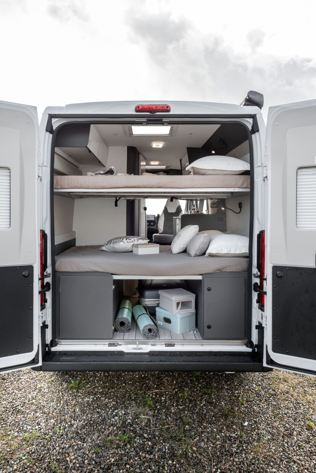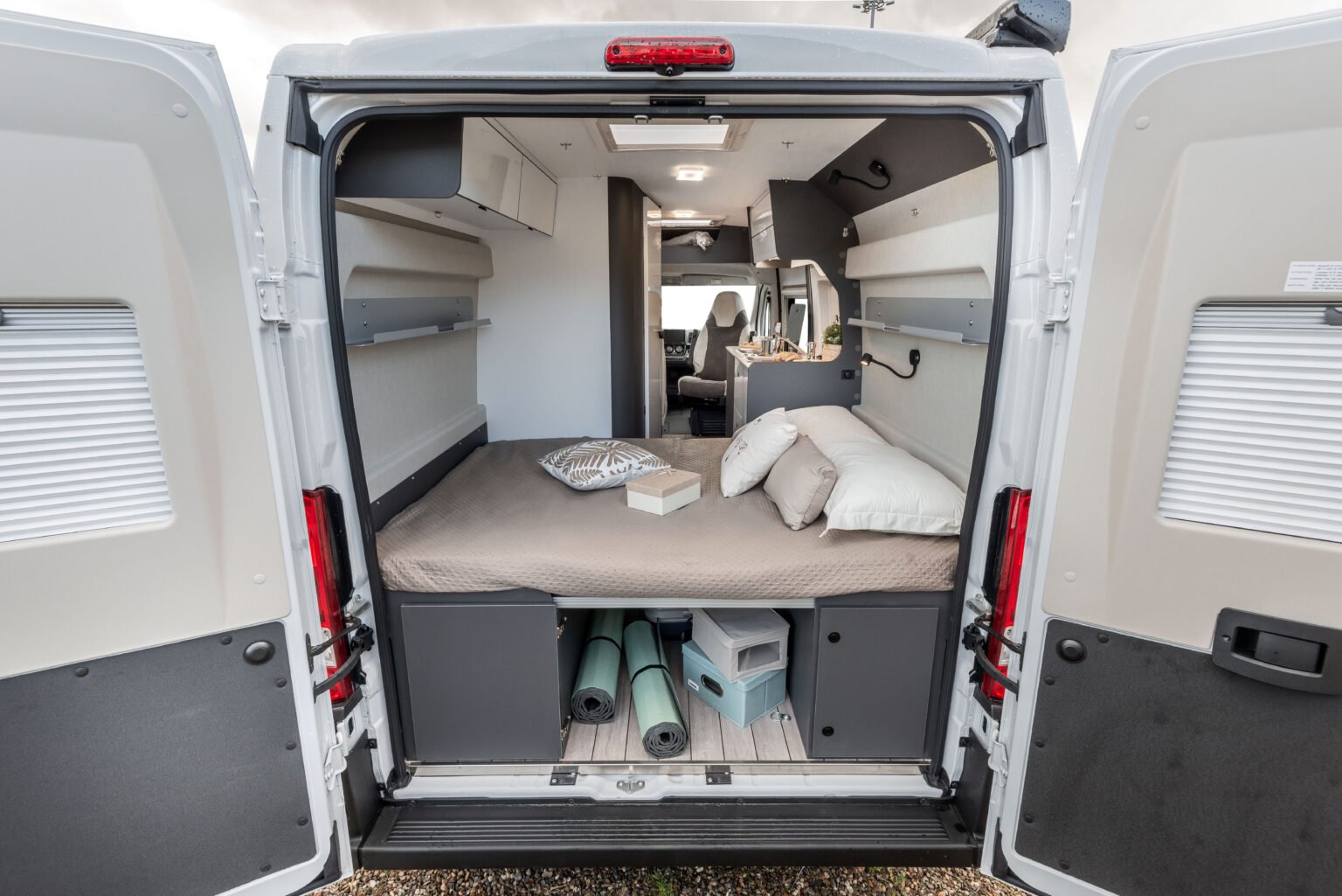 La zone jour se distingue par son design linéaire et moderne, rehaussé par une nouvelle sellerie inspirée du monde de l’automobile, en phase avec les tendances actuelles. La table ergonomique avec extension offre une grande polyvalence, idéale pour manger ou travailler à l’intérieur comme à l’extérieur du véhicule. L’espace est complété par des solutions d’organisation intelligentes : un placard, un compartiment supérieur et des porte-gobelets pratiques rendent chaque voyage encore plus confortable et ordonné.