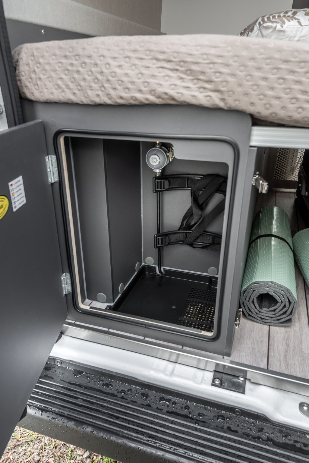 La cuisine linéaire avec plan de cuisson à deux feux offre un espace de rangement généreux et bien organisé : trois tiroirs spacieux et un élément mural avec éclairage tactile LED intégré garantissent l’ordre et la fonctionnalité. Le réfrigérateur à compression de 84 litres, qui peut être ouvert à 180°, est la solution idéale pour les déjeuners et les en-cas à l’extérieur, ce qui rend chaque pause en plein air encore plus agréable.