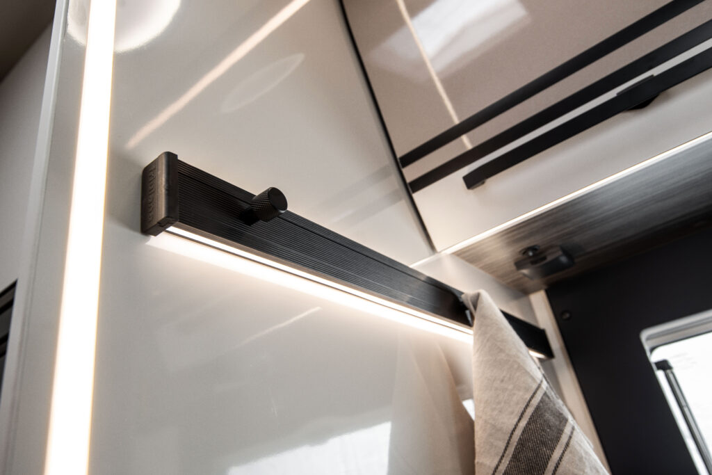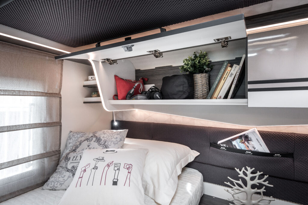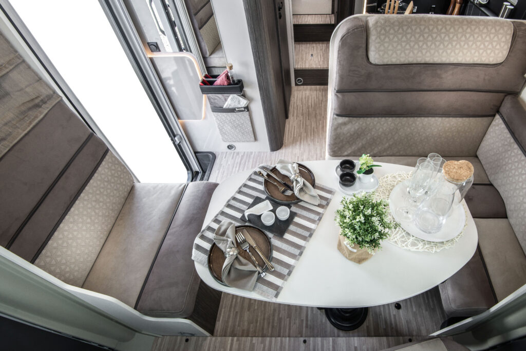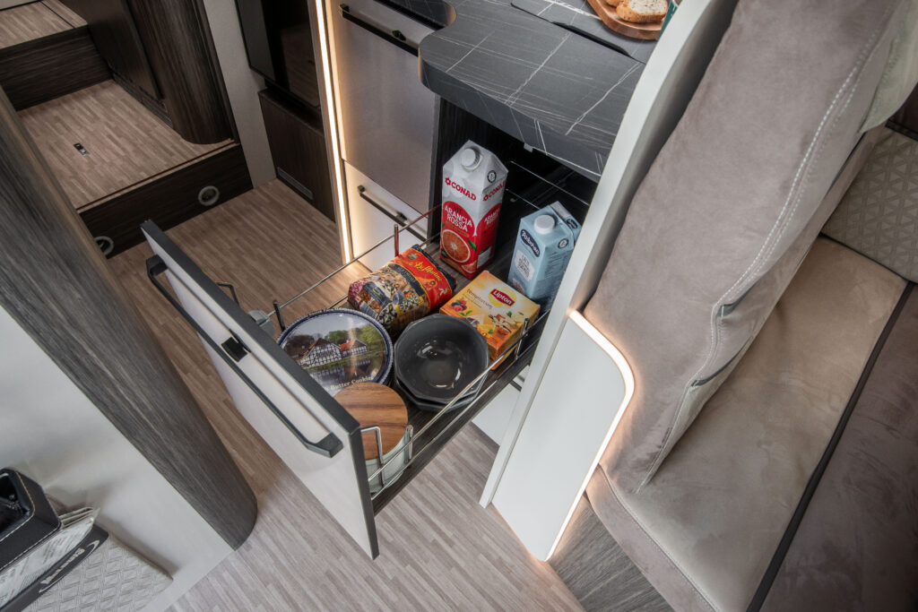 La zone jour est conçue pour offrir un environnement accueillant et polyvalent, idéal pour partager des moments de détente et de convivialité. Elle peut accueillir jusqu’à cinq personnes dans un espace spacieux et lumineux, caractérisé par un canapé d’angle et un canapé latéral qui garantissent confort et liberté de mouvement. Le panneau de commande iNet X permet une gestion simple et centralisée de toutes les fonctions de bord.