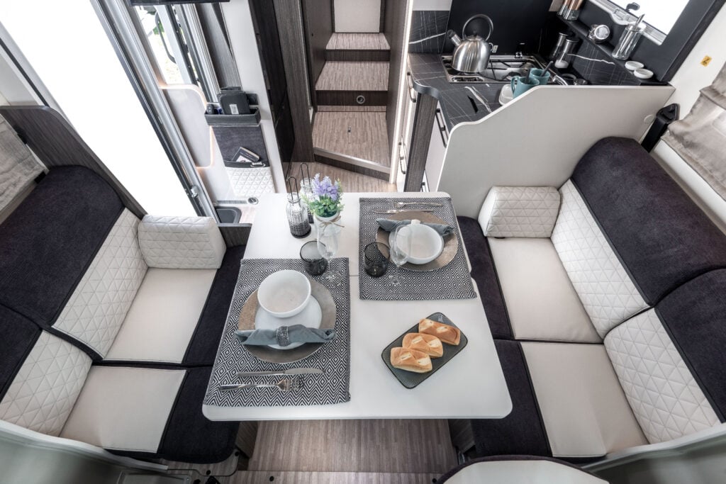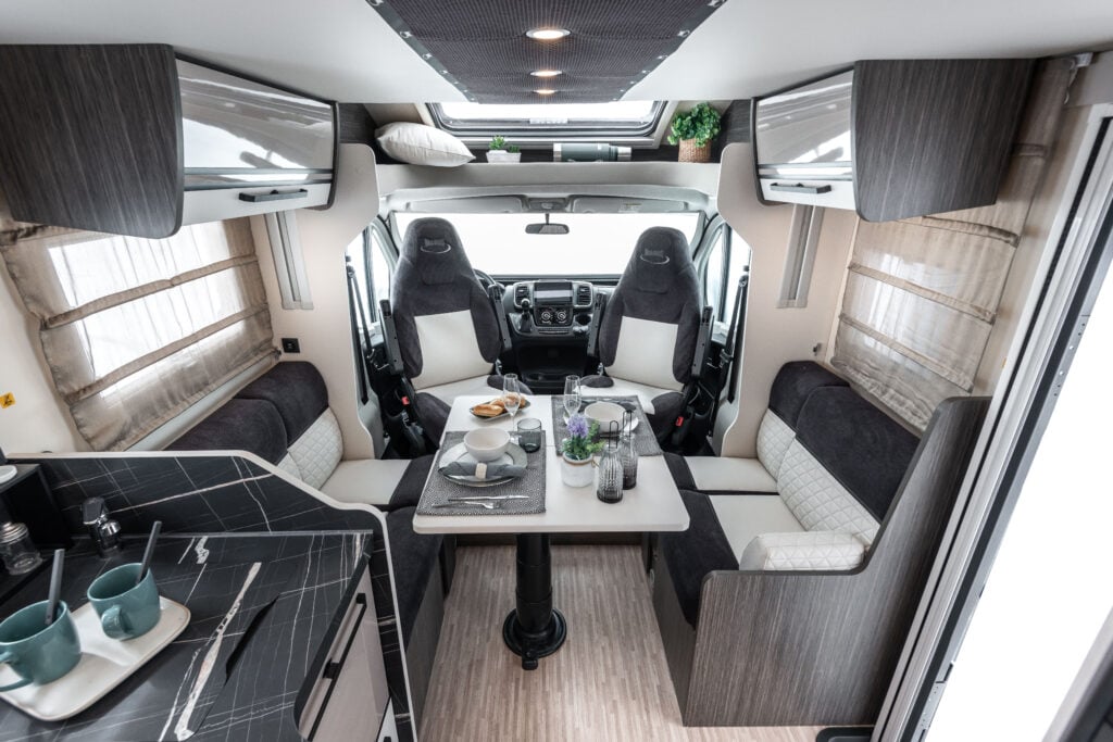 La table à livre coulissante et pivotante à 360° offre une flexibilité maximale pour les repas et les moments conviviaux. Le panneau de commande iNet X permet de gérer facilement toutes les fonctions de bord. La porte rigide séparant la zone jour et la zone nuit garantit intimité et tranquillité.