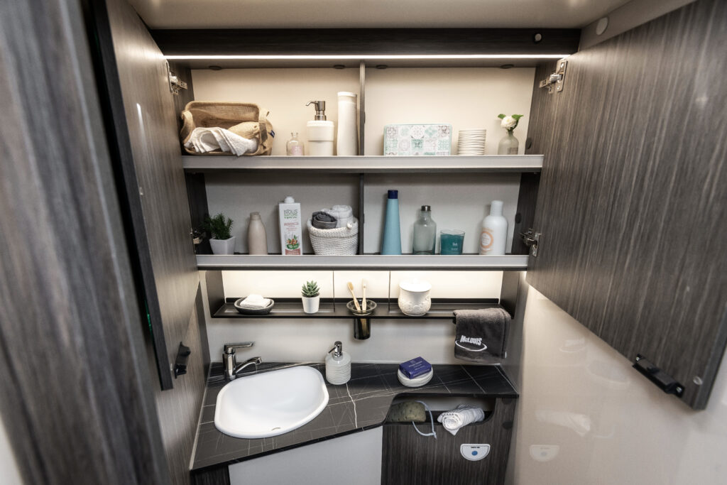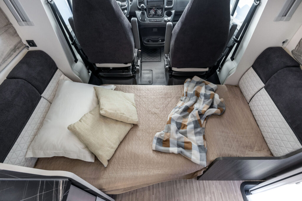 La zone nuit a été conçue pour offrir un confort maximal durant la nuit. Les sommiers des lits jumeaux sont relevables, permettant un accès aisé à l’espace situé sous les lits grâce à une ouverture rabattable pratique.