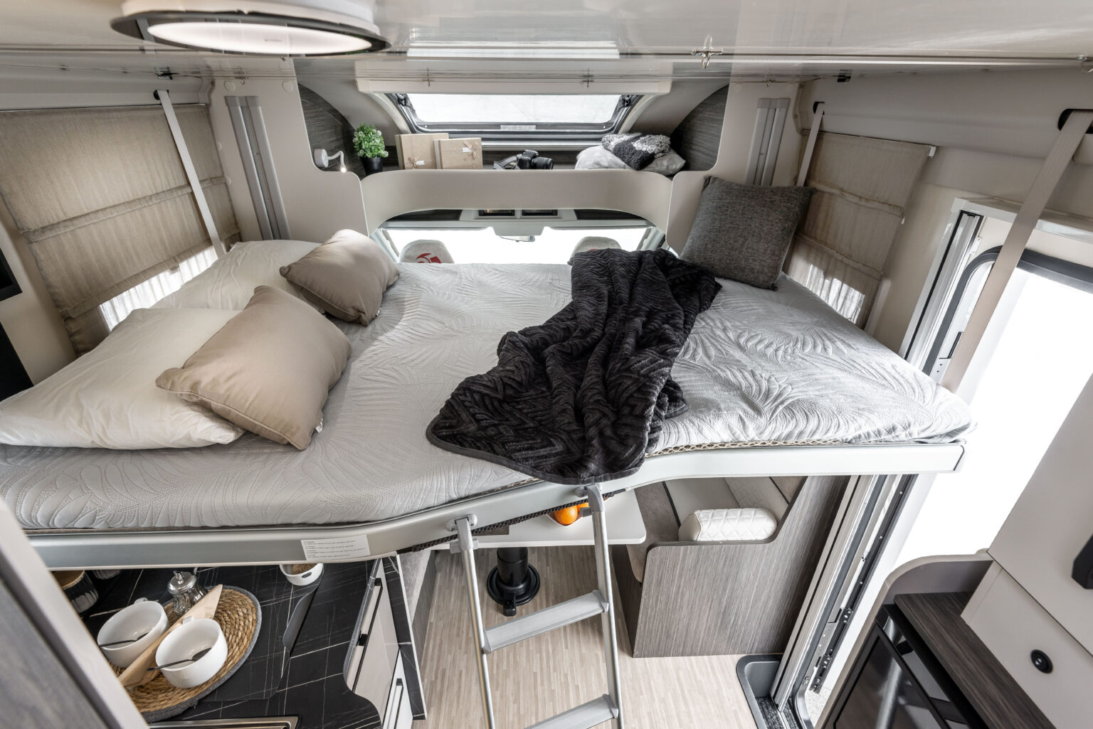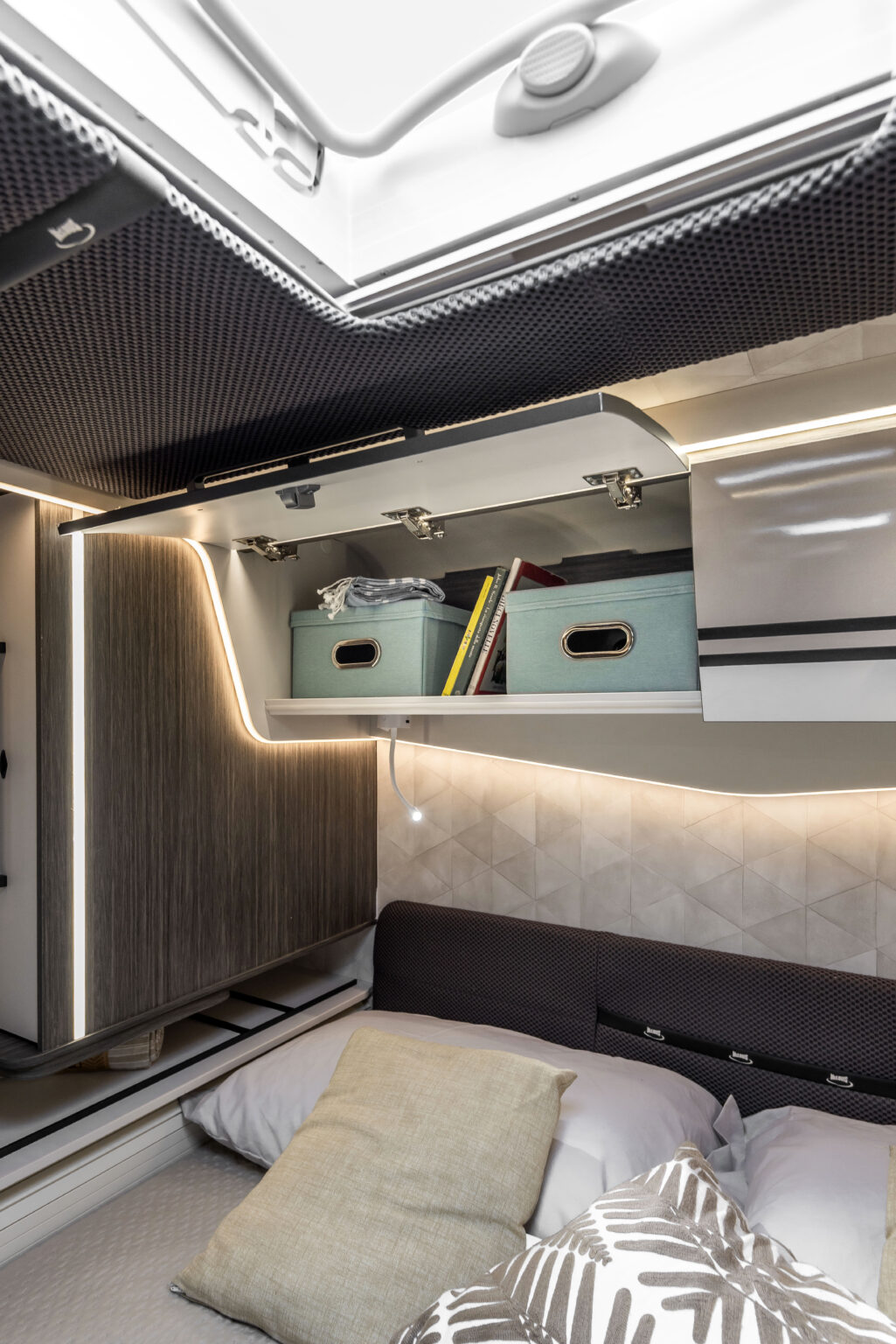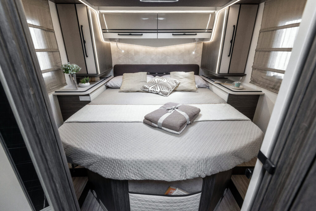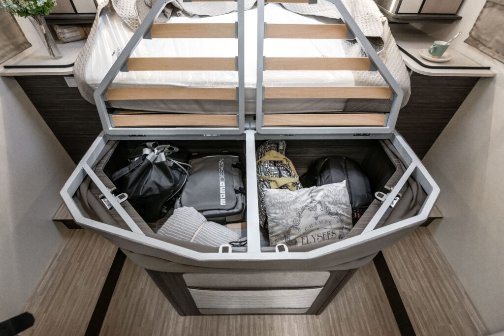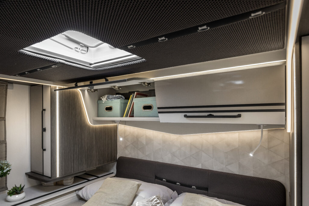 La zone nuit accueille un lit double central, accompagné de grandes armoires suspendues avec tablettes rotatives et de tables de chevet dotées de rebords de maintien. Grâce au système électrique de réglage de la hauteur du lit, l’espace peut être modulé selon les besoins, offrant plus de confort dans la chambre ou davantage de volume dans le garage.