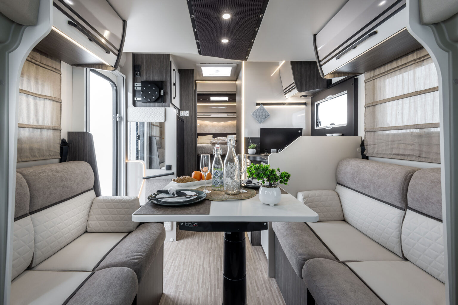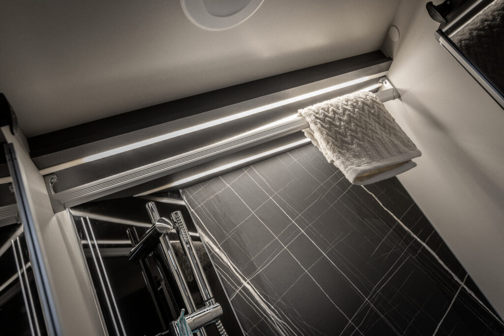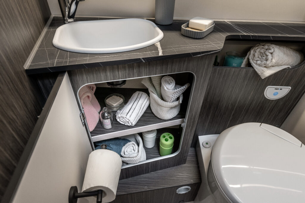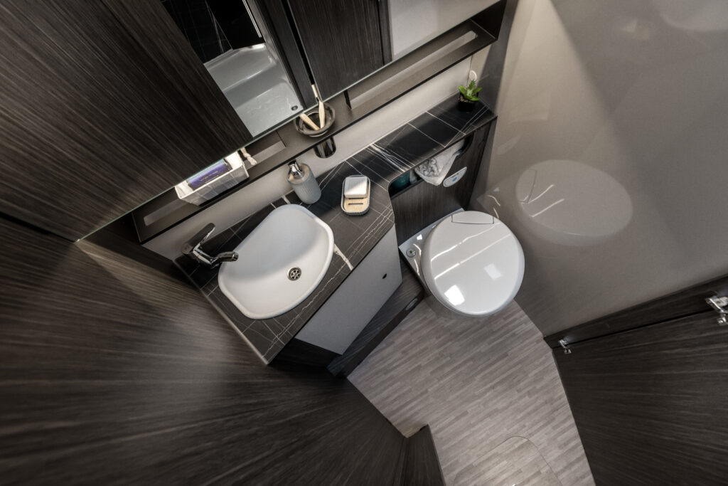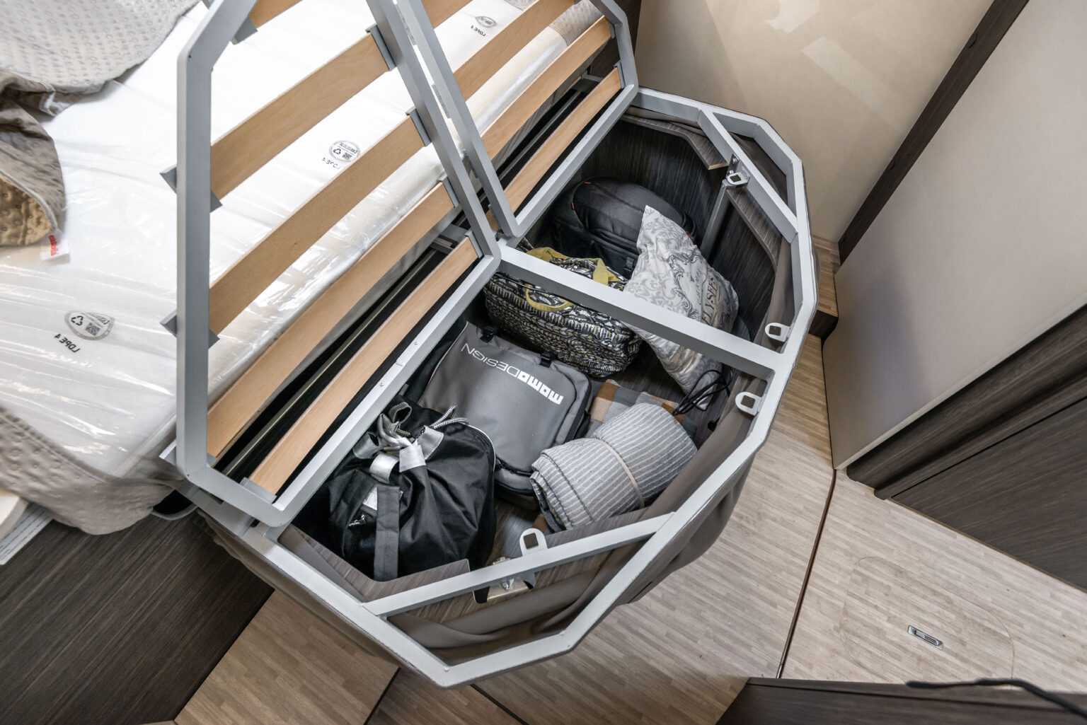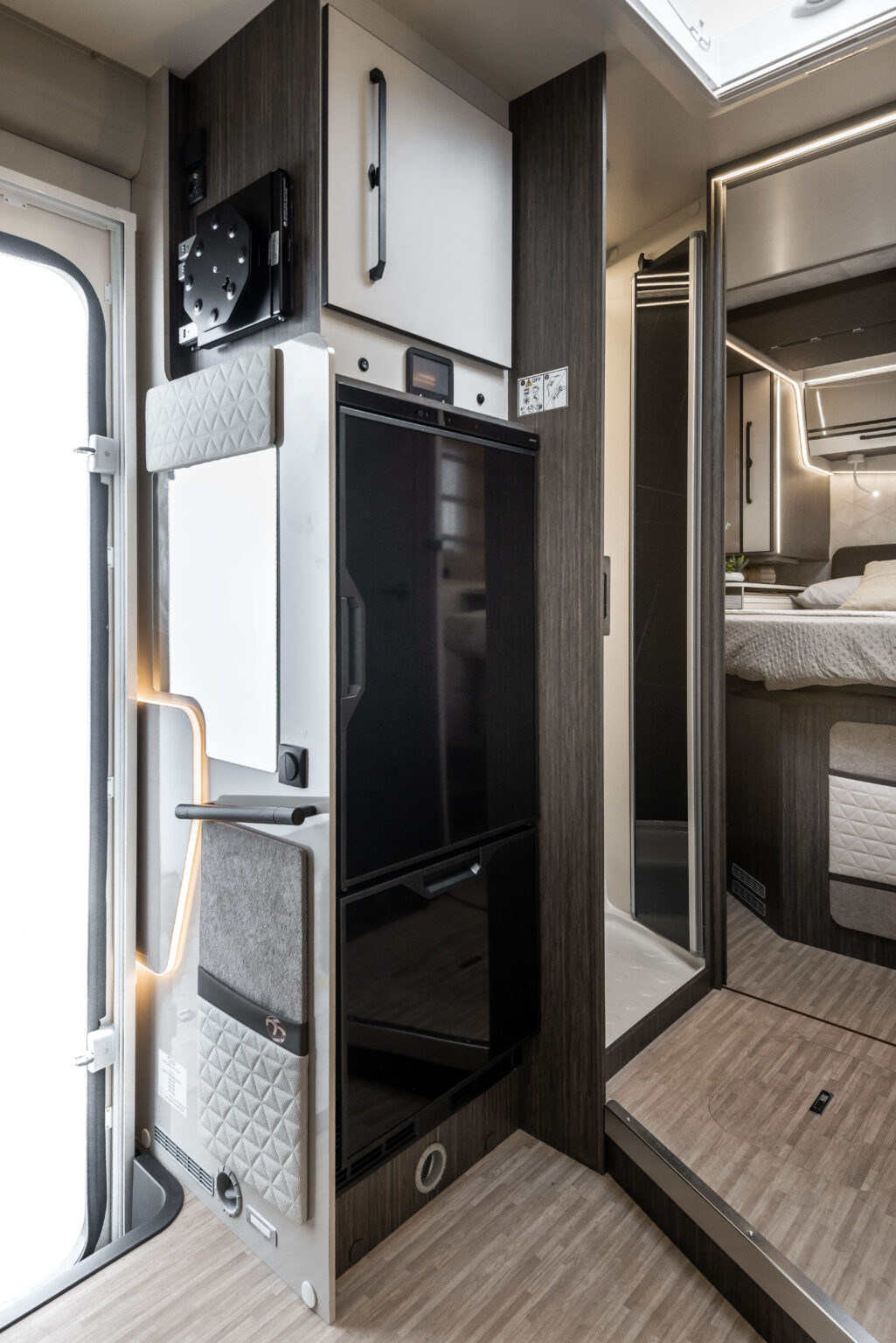 La zone nuit accueille un lit double central, accompagné de grandes armoires suspendues avec tablettes rotatives et de tables de chevet dotées de rebords de maintien. Grâce au système électrique de réglage de la hauteur du lit, l’espace peut être modulé selon les besoins, offrant plus de confort dans la chambre ou davantage de volume dans le garage.