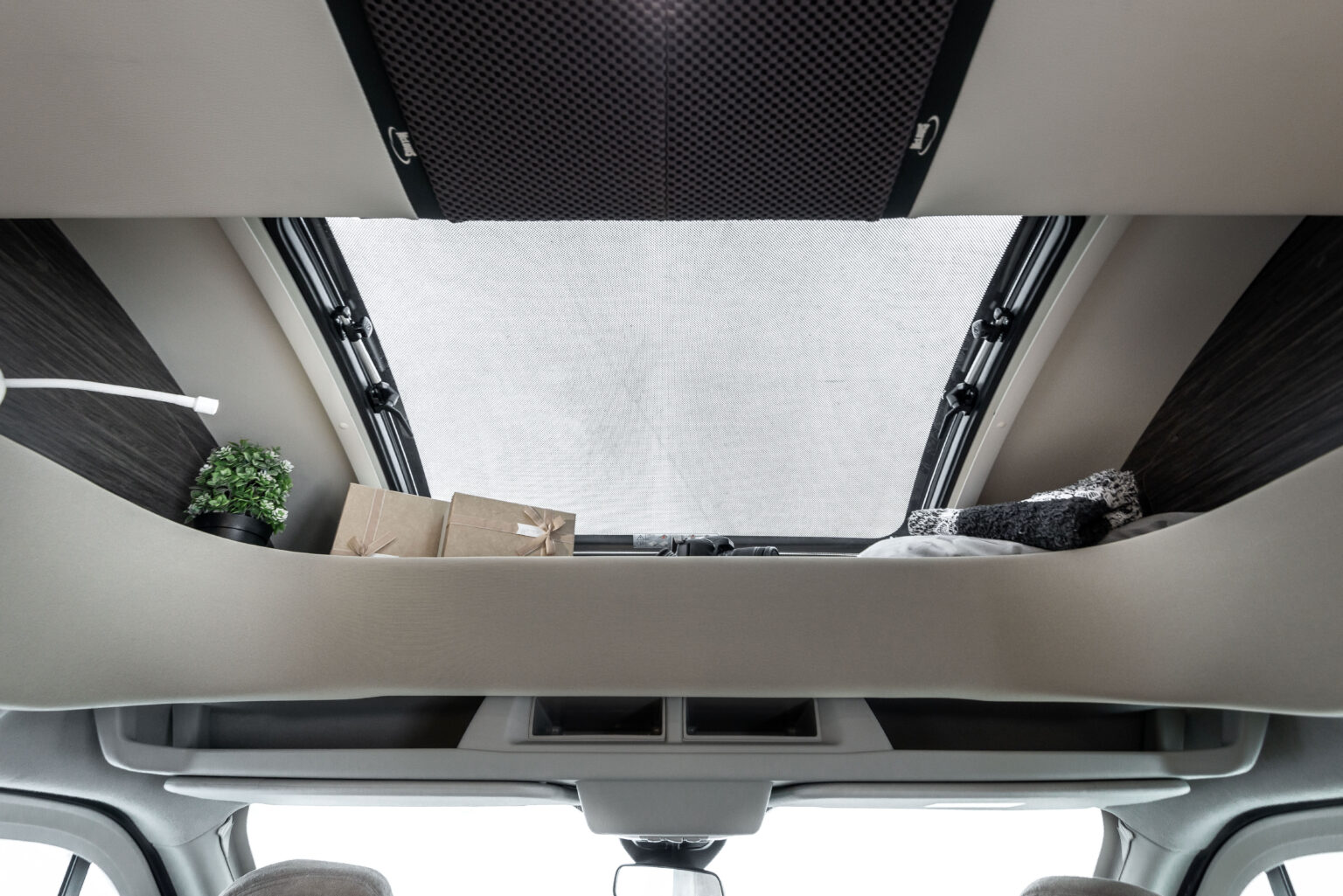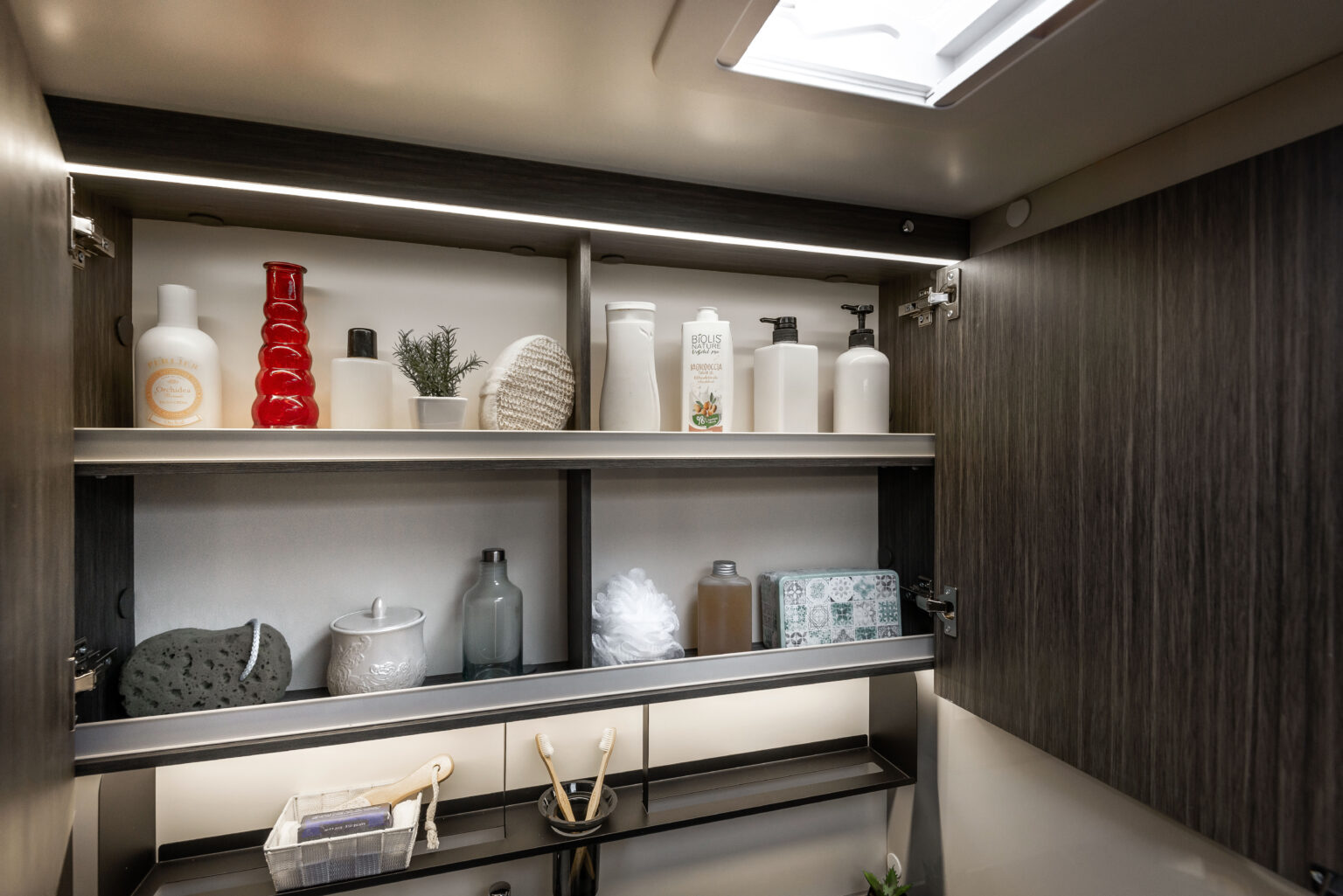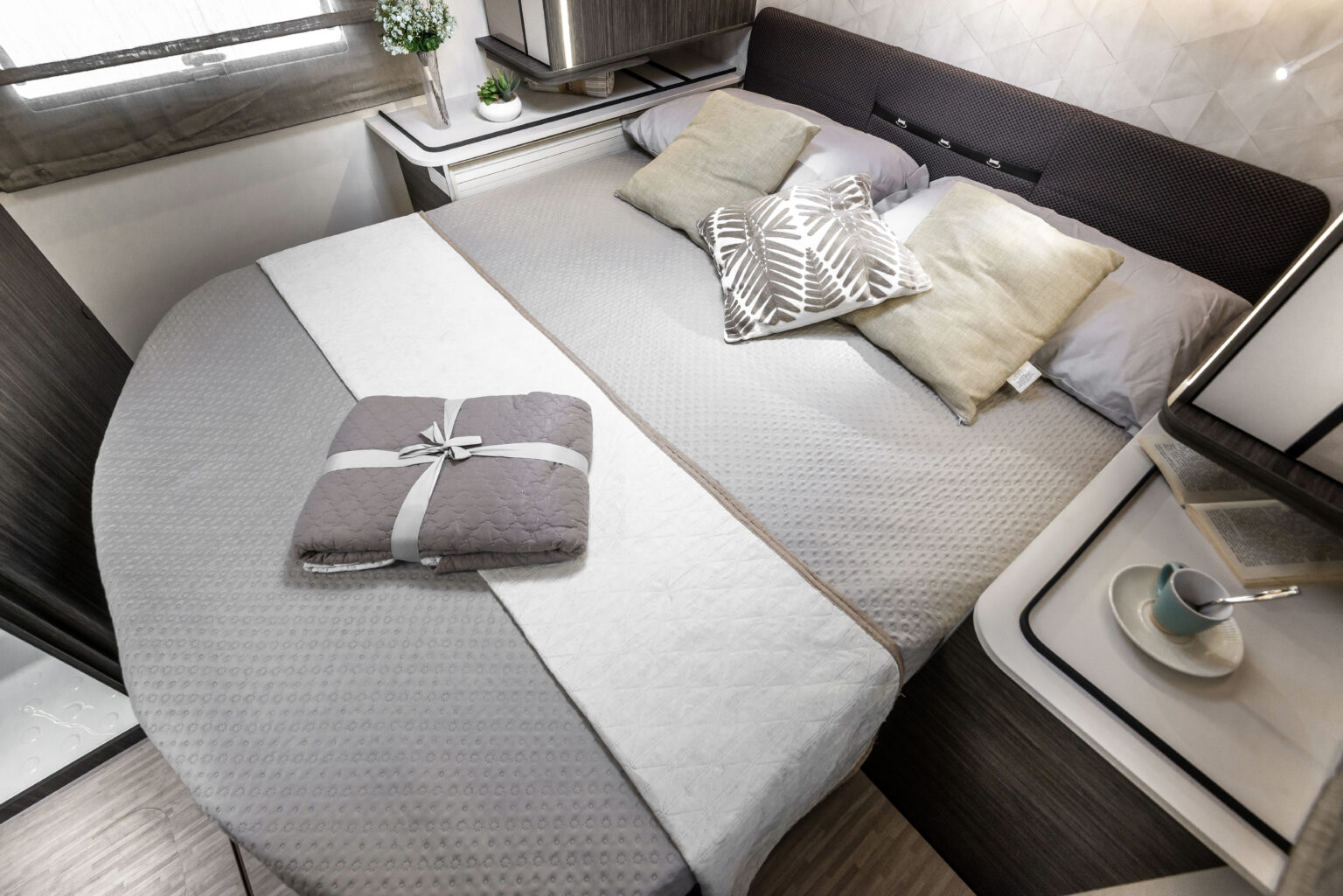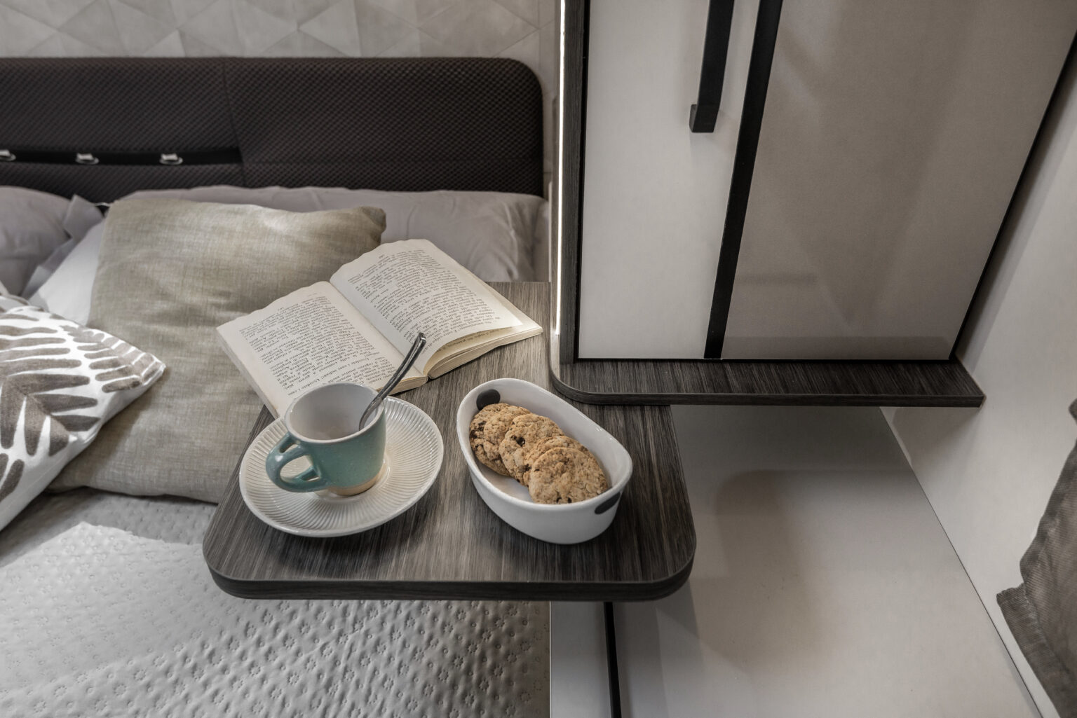 La zone nuit accueille un lit double central, accompagné de grandes armoires suspendues avec tablettes rotatives et de tables de chevet dotées de rebords de maintien. Grâce au système électrique de réglage de la hauteur du lit, l’espace peut être modulé selon les besoins, offrant plus de confort dans la chambre ou davantage de volume dans le garage.