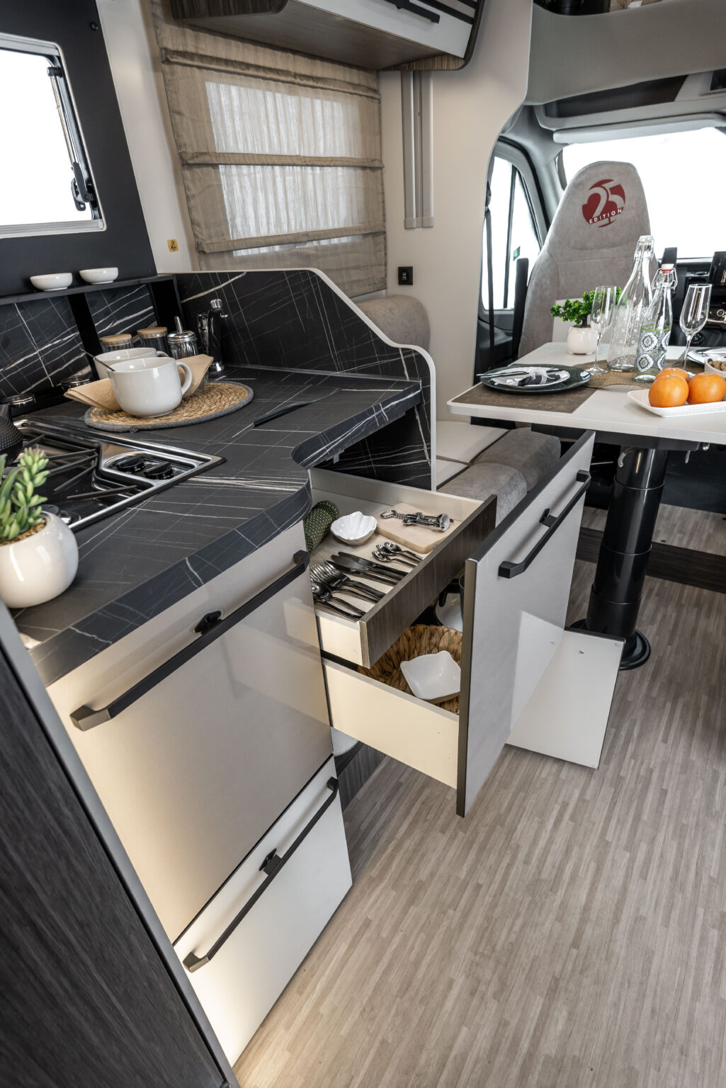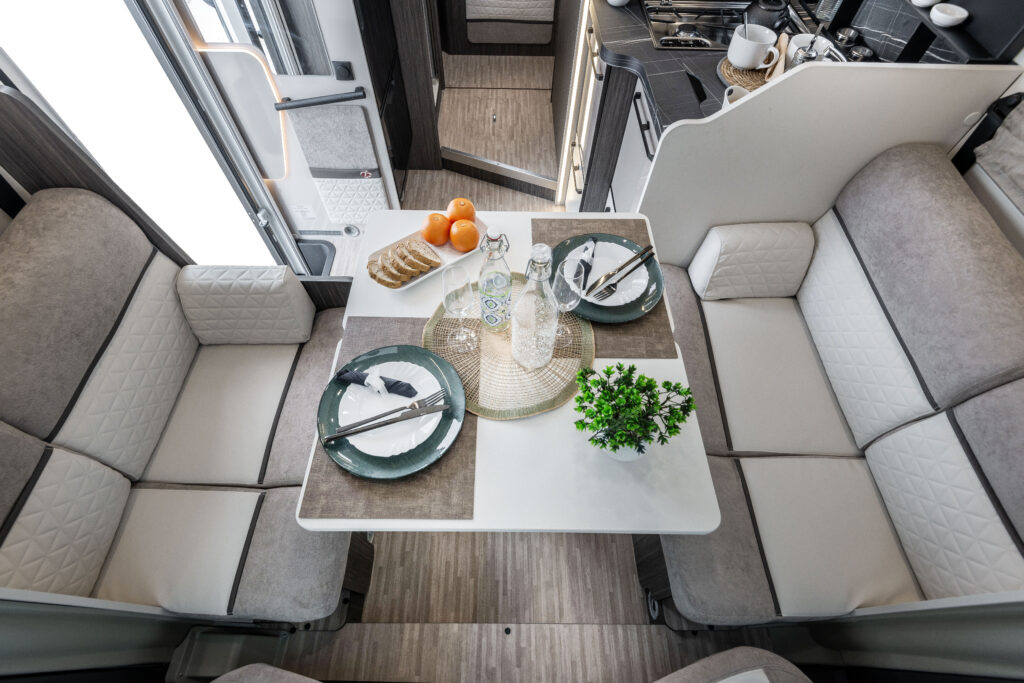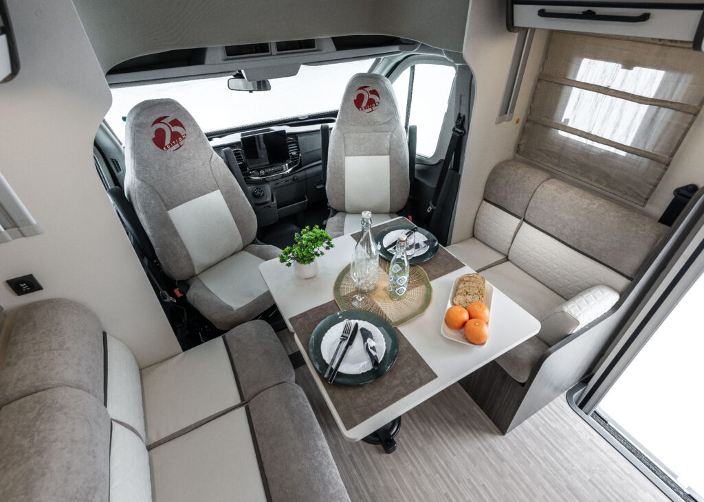 Sur les modèles face à face, les sièges de la dînette se transforment facilement en sièges confort pendant le voyage. Grâce à un système pratique et intuitif, le coussin se transforme d’accoudoir en support pour la tête, offrant plus de confort et d’ergonomie lors des déplacements. Le passage du mode repos au mode voyage (et vice versa) se fait rapidement, grâce au nouveau support rotatif pratique.