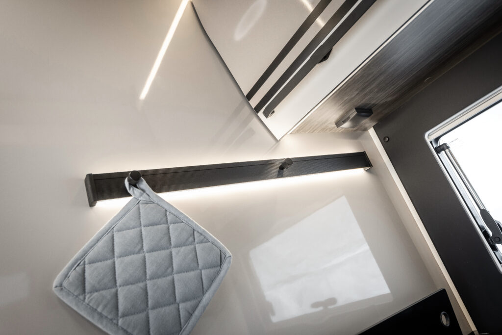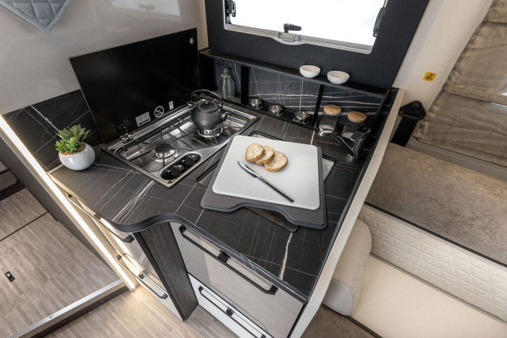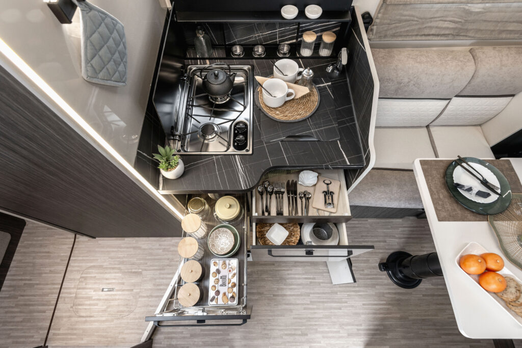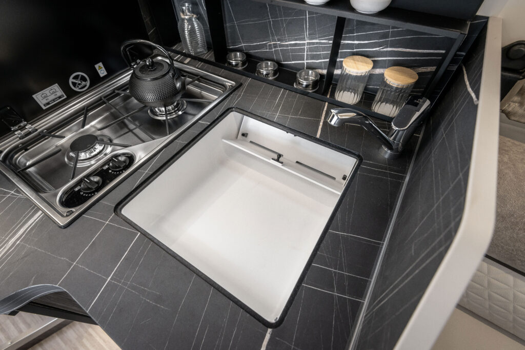 La cuisine associe praticité et élégance. Elle est équipée d’un plan de cuisson premium à 2 feux, d’un évier avec bonde invisible et porte-éponge, accompagné d’un couvre-évier faisant office de planche à découper. Les rangements sont nombreux et fonctionnels : un meuble haut avec étagère, deux tiroirs à fermeture amortie (dont un avec tiroir interne), un panier coulissant, une trappe, ainsi qu’un porte-épices ouvert, des porte-objets et accessoires muraux.