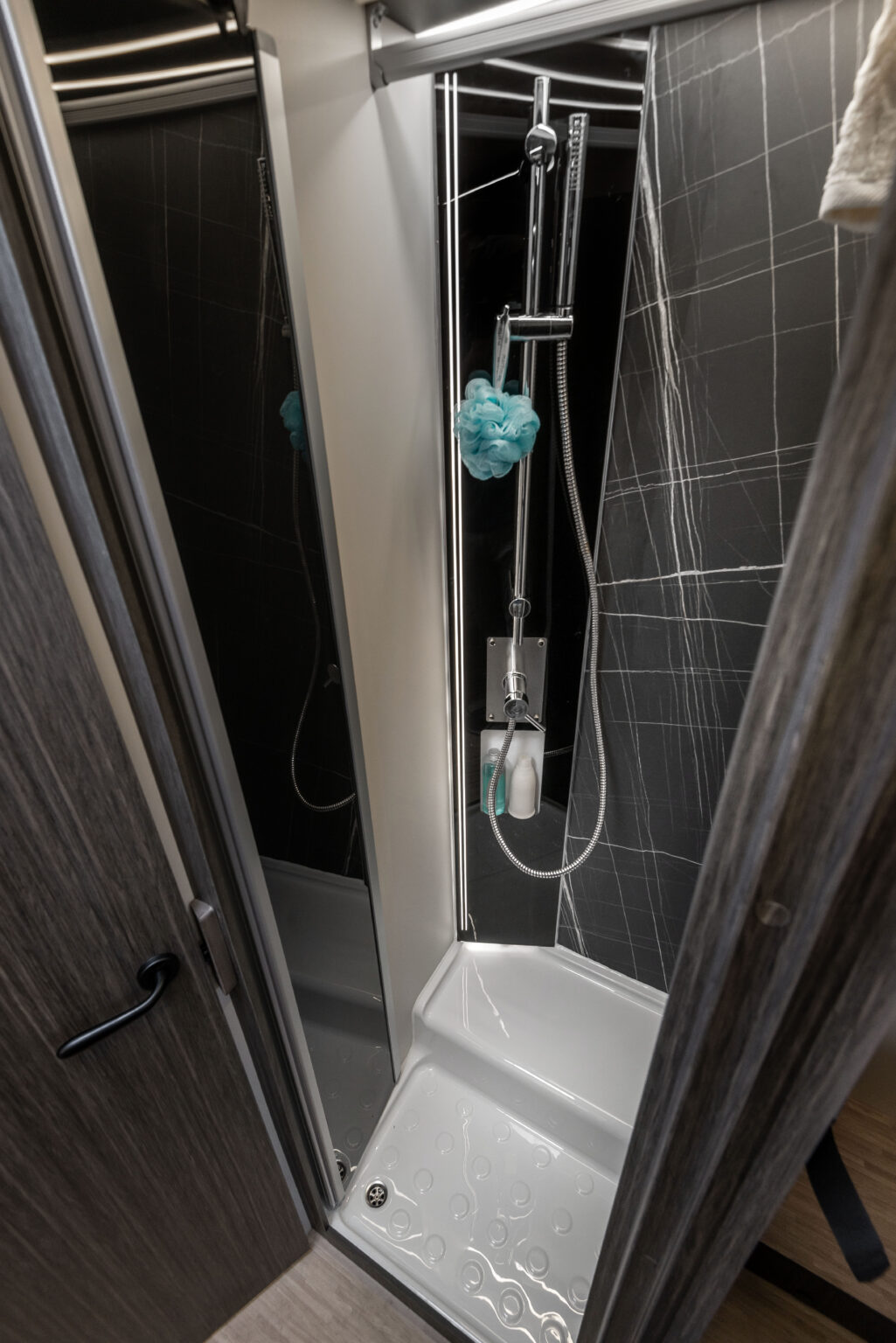 La salle de bains est équipée d’un lanterneau 28×28 pour plus de luminosité, d’une douche indépendante et d’un grand placard avec miroir. Chaque détail est conçu pour optimiser l’espace disponible, en offrant un environnement toujours ordonné et fonctionnel.