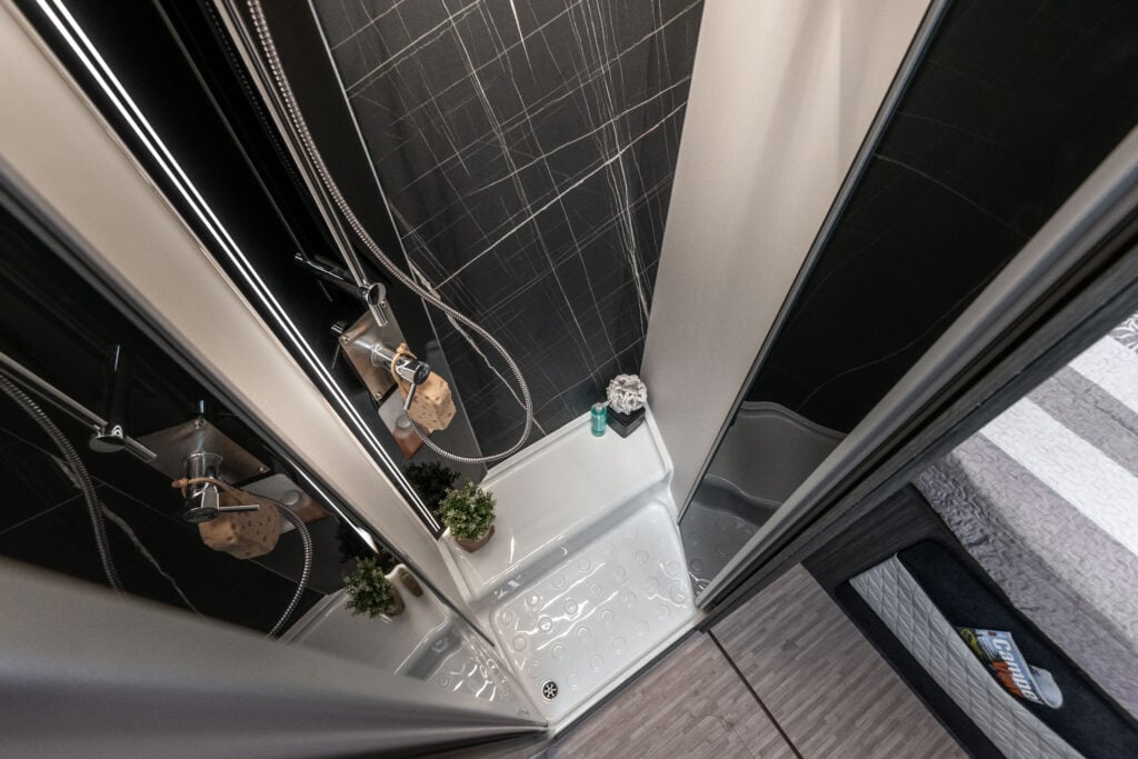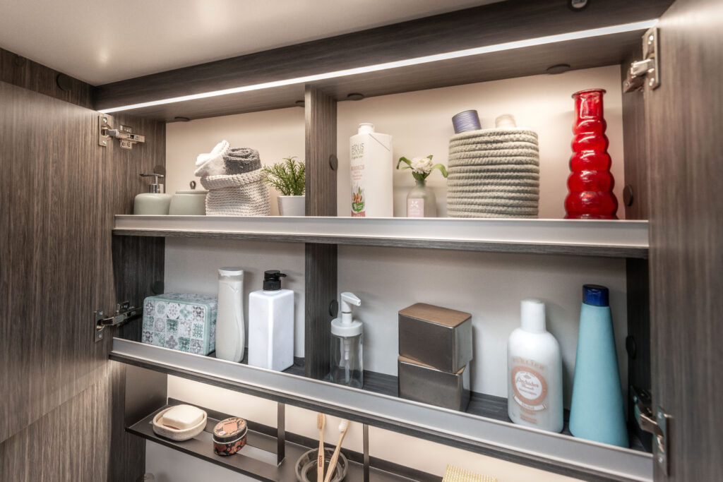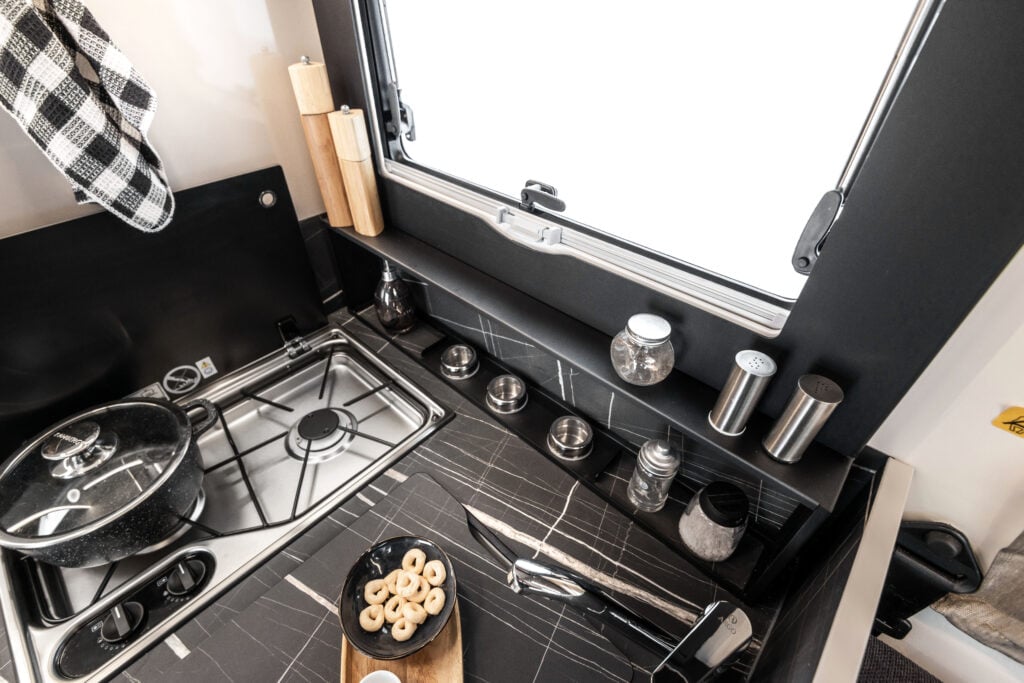 La cuisine a été conçue pour offrir un espace de vie ouvert et spacieux, parfaitement intégré à l’ensemble du véhicule. Le plan de cuisson premium à deux feux en ligne permet de cuisiner en toute facilité, tandis que l’évier, doté d’une bonde invisible et d’un porte-éponge intégré, allie design et praticité.
