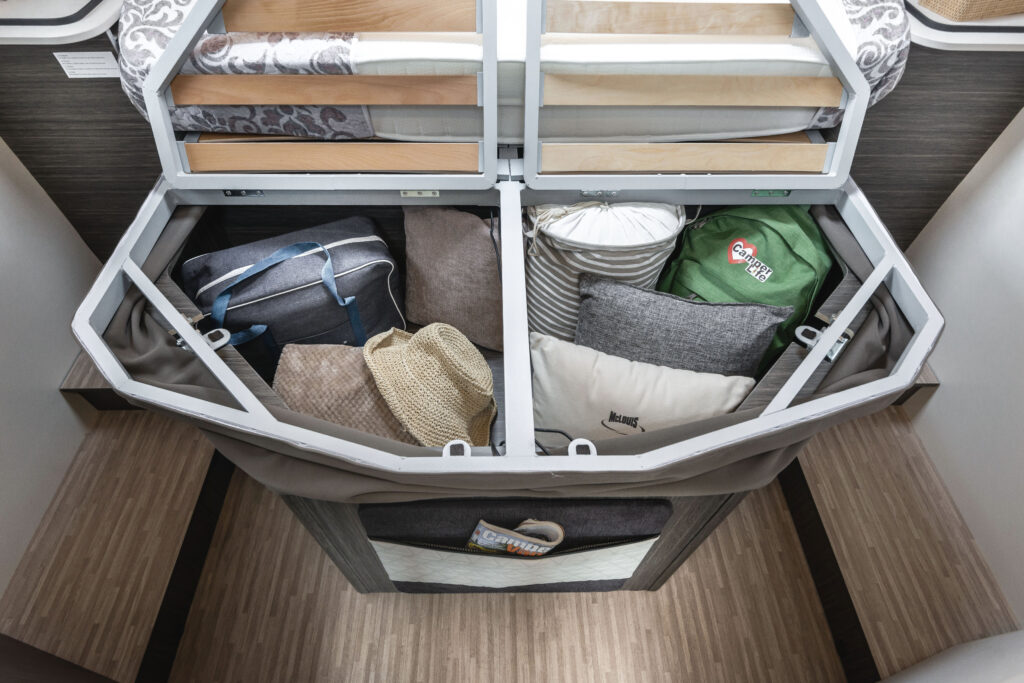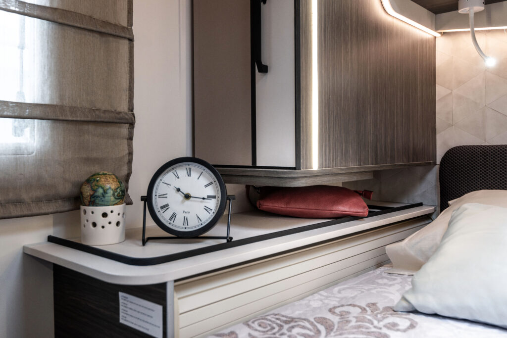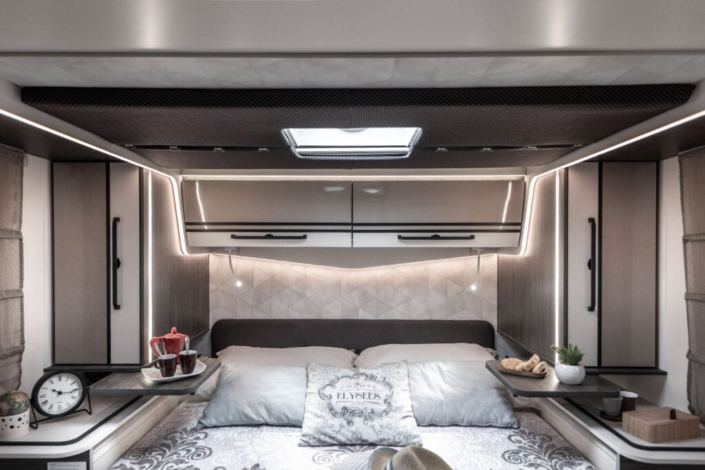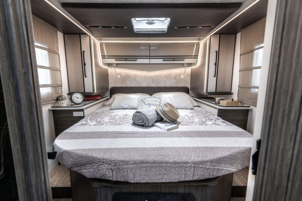 La zone nuit offre un confort optimal grâce au lit double central, garantissant une nuit reposante. Les armoires suspendues avec tablettes rotatives et tables de chevets avec rebords de maintientout en optimisant l’espace de rangement.