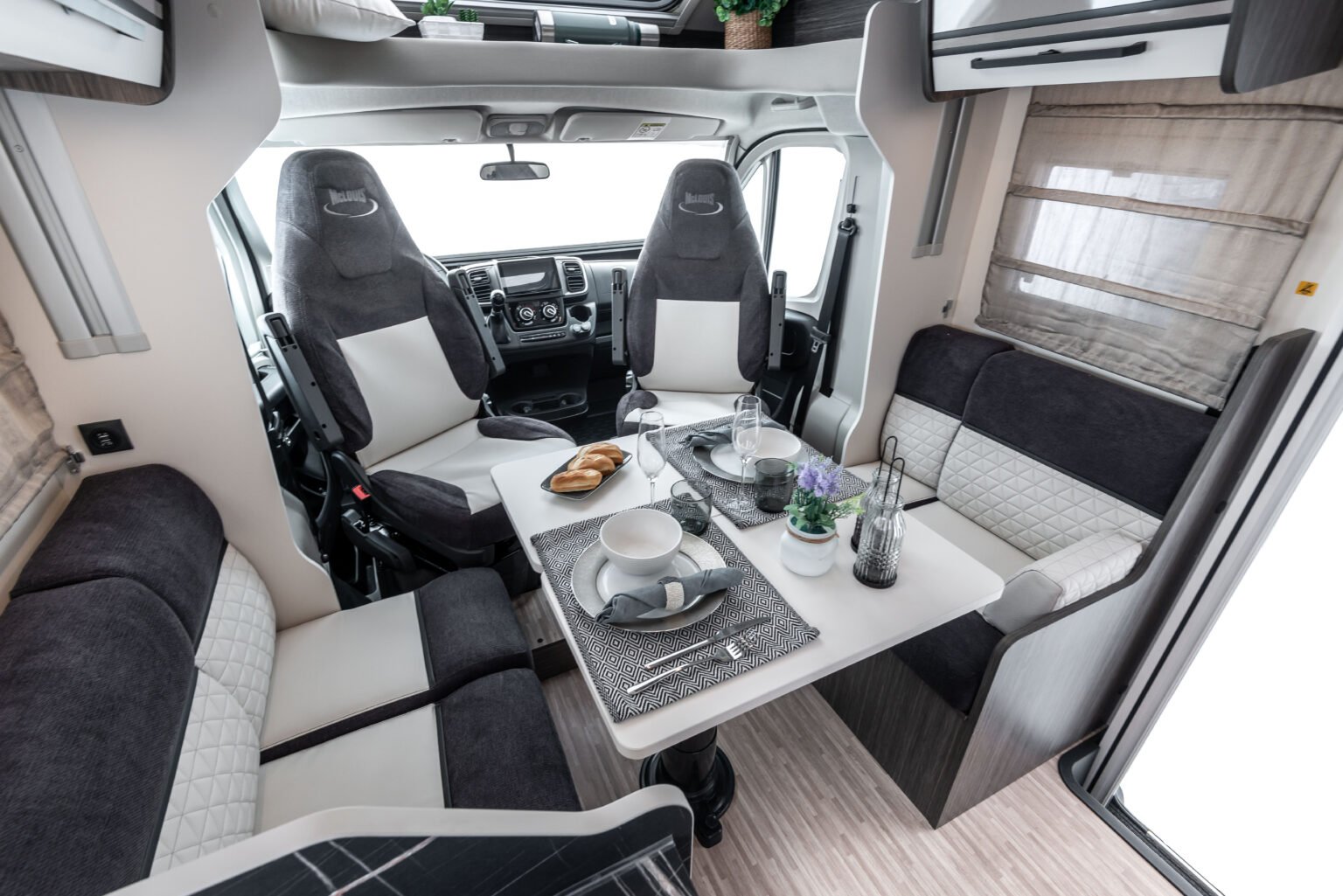 In face-to-face dinette models, the dinette seats easily convert to Comfort Seats during travel. Using a practical and intuitive system, the cushion converts from an armrest to a support for the head, providing greater comfort and ergonomics while traveling. Conversion from rest mode to travel mode (and vice versa) is quick and smooth, made possible by the new practical rotating support.