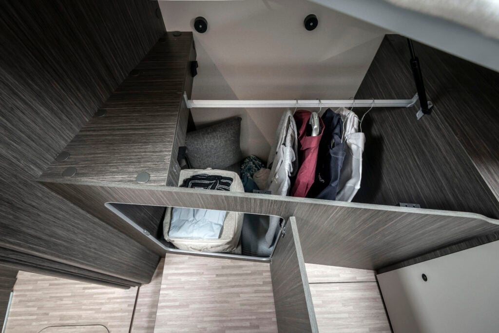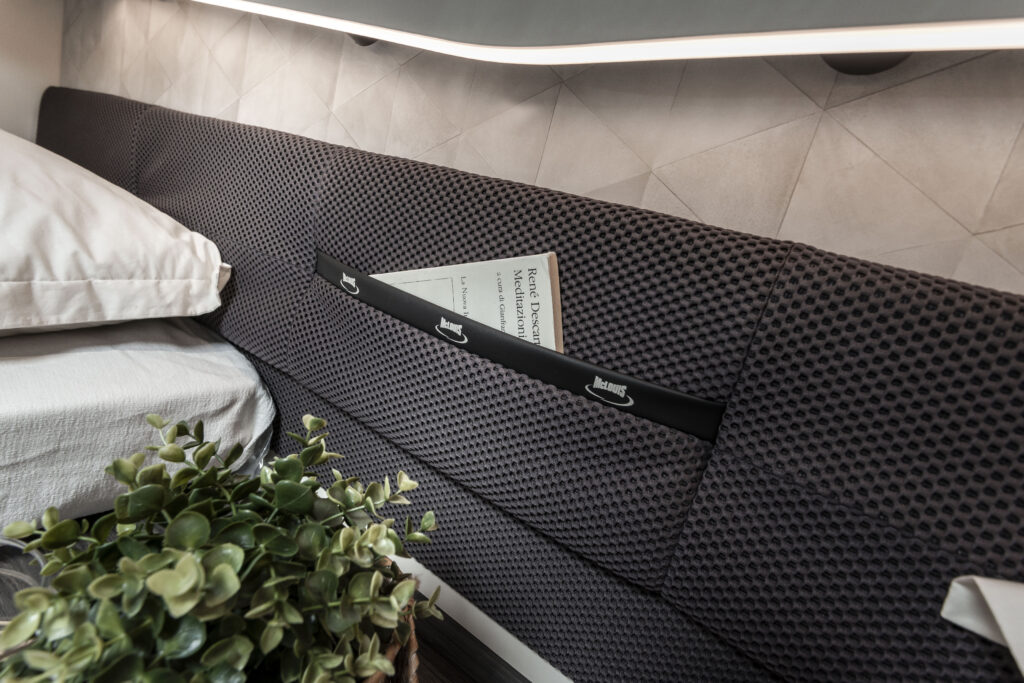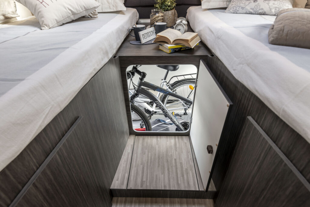 La zona notte garantisce comfort e funzionalità in un ambiente progettato per ottimizzare lo spazio e favorire il relax. I letti gemelli da 2 metri offrono la massima comodità, mentre lo stivaggio sotto le doghe sollevabili consente di riporre oggetti ingombranti senza ridurre lo spazio vivibile. Il pratico accesso al garage facilita le operazioni di carico e scarico. L’area è completata da un ampio armadio e pensili con ripiano e doppie mensole laterali, perfetti per mantenere tutto ordinato e a portata di mano.