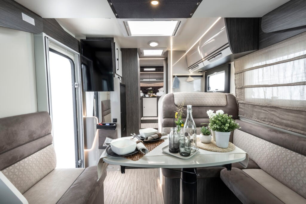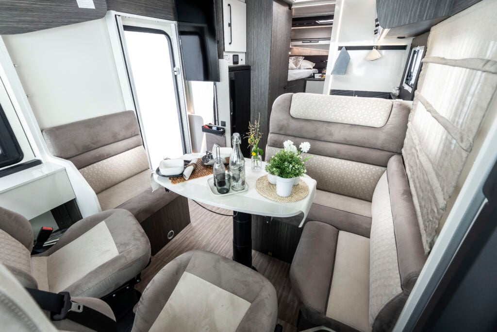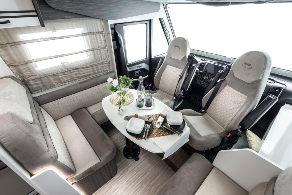 Motorhome di 7,45 m di lunghezza con salone con tavolo centrale traslabile e ruotabile di 360° e letti gemelli in coda trasformabili in maxi matrimoniale.