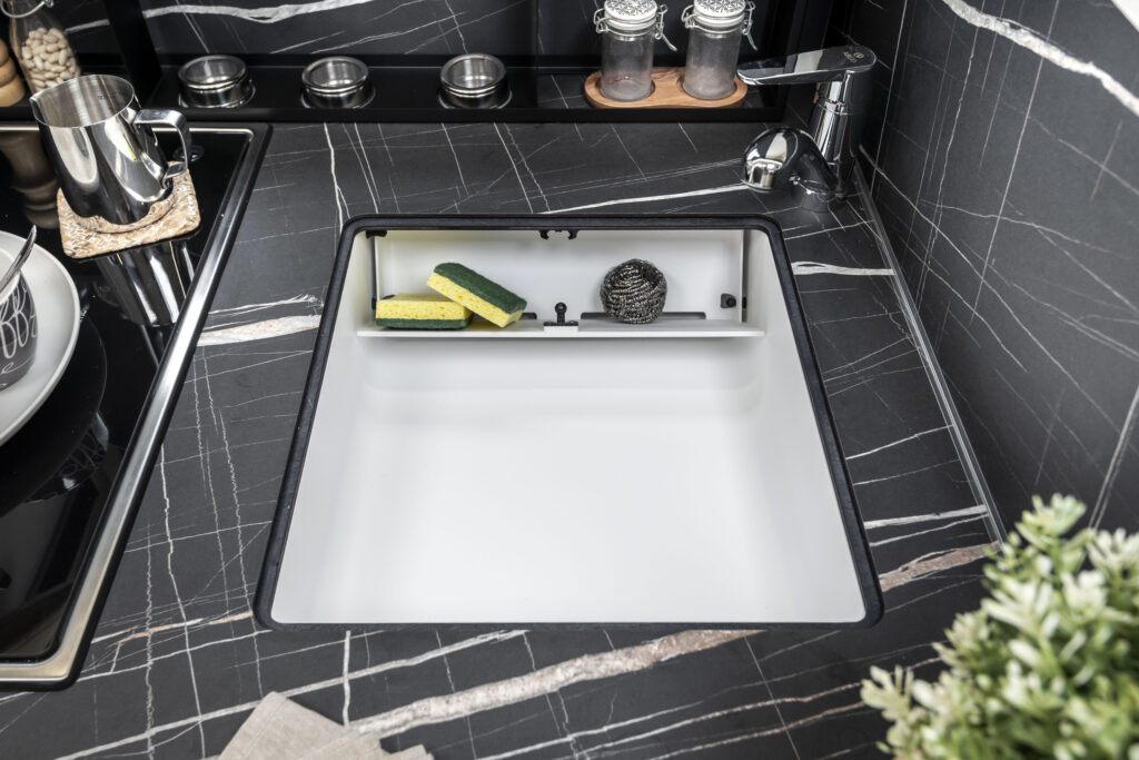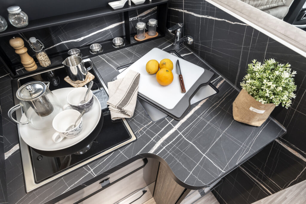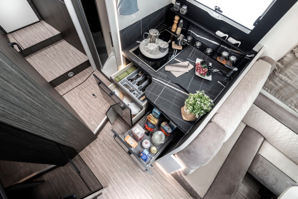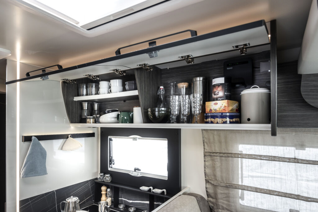 La cucina unisce funzionalità e design, con piano cottura premium a 2 fuochi e lavello con scarico invisibile. I vani di stivaggio, pensili e cestoni soft-close, permettono di organizzare utensili e provviste. Completano l’allestimento coprilavello/tagliere, porta spezie e accessori a parete, per una cucina pratica e ordinata in viaggio. L’ampio frigorifero da 158 l a compressore è l’ideale per conservare tutti gli ingredienti.