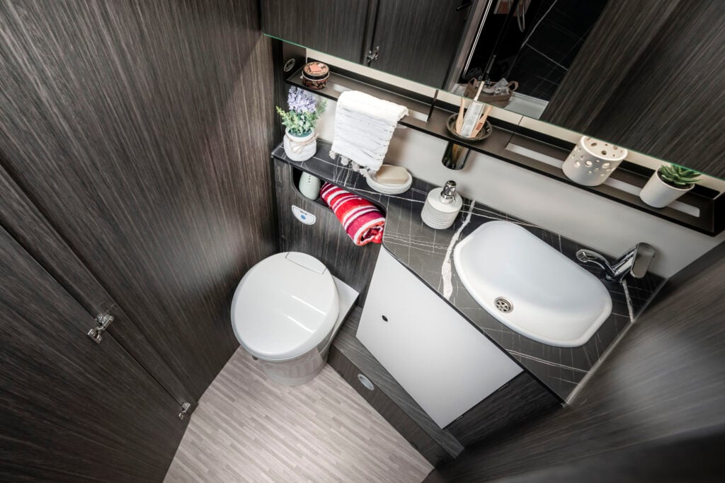 Il bagno offre massimo comfort, funzionalità e privacy durante il viaggio. L’oblò garantisce luce naturale e aerazione, mentre l’ampia doccia indipendente assicura praticità e facilità d’uso. L’ambiente include un armadietto a specchio e un ripiano portaoggetti a tutta lunghezza con portaspazzolino integrato, ideali per mantenere tutto in ordine. La porta del bagno può servire come separazione tra zona giorno e zona notte, assicurando privacy e funzionalità in ogni momento.