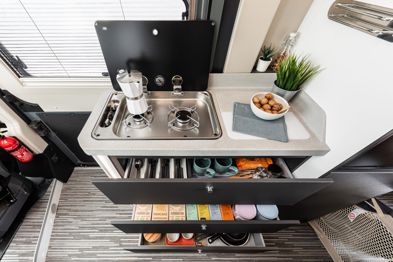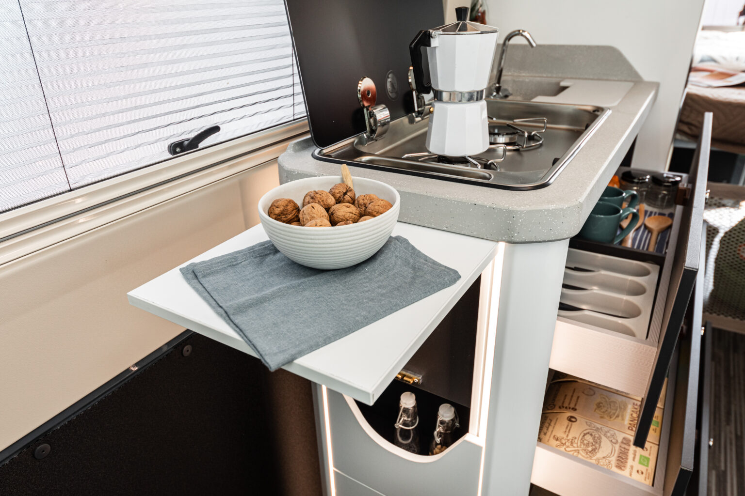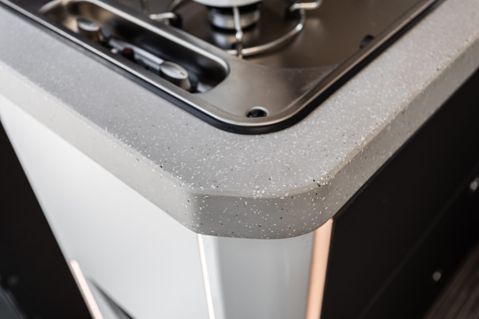 Kjøkkenet er utstyrt med to kokeplater og oppvaskkum, og kjennetegnes av de eksklusive akrylsteinsplatene