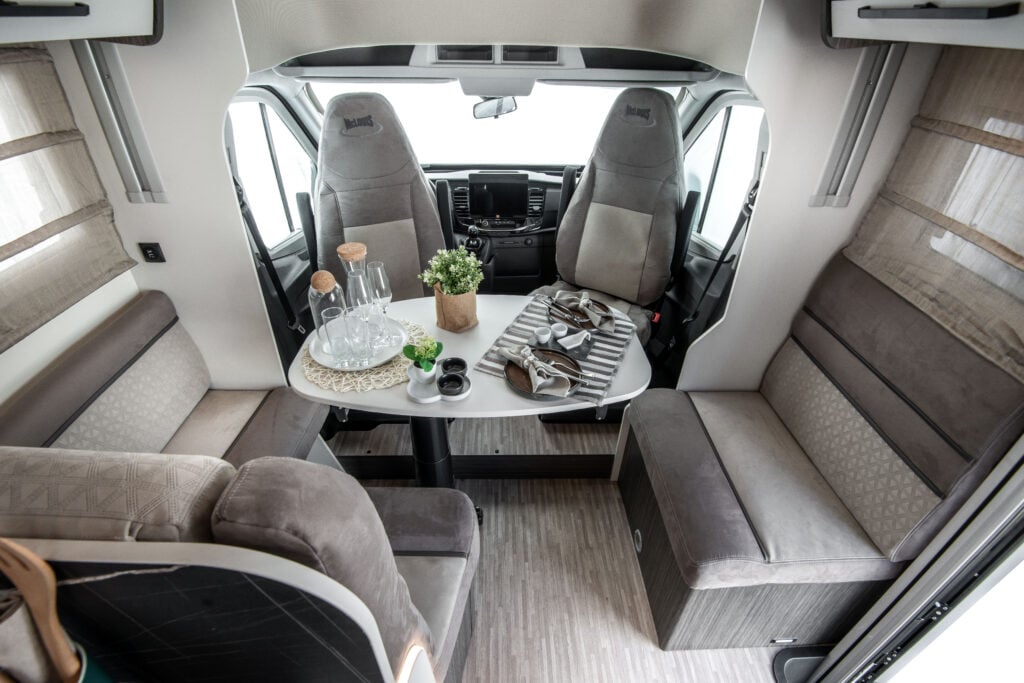 The living area is designed to offer a welcoming and versatile environment, ideal for sharing moments of relaxation and conviviality. It can accommodate up to five people in a spacious and bright space, featuring a corner sofa and a side sofa that guarantee comfort and freedom of movement. The iNet X control panel allows for simple and centralised management of all on-board functions. If necessary, the dinette can be converted into a single bed, while the rigid door separating the living and sleeping areas ensures privacy.