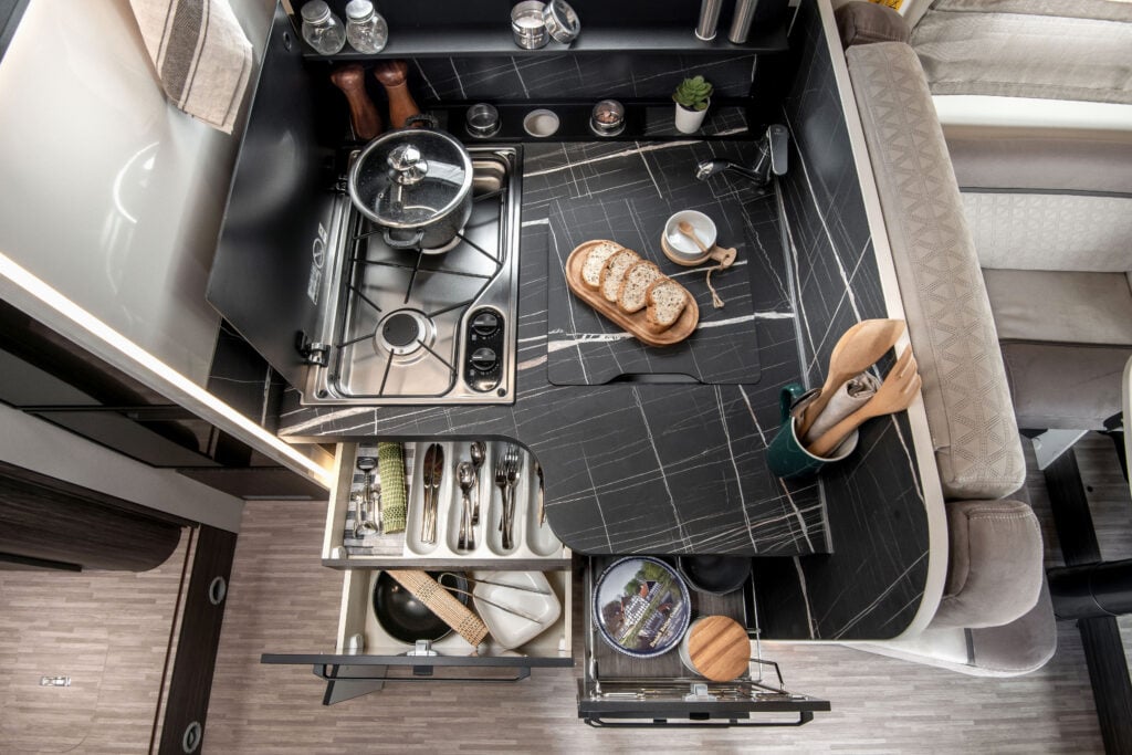 The kitchen combines stylish design and maximum functionality, offering a practical and pleasant environment. The large 158-litre compressor refrigerator is ideal for storing all your ingredients. The premium 2-burner hob and sink with invisible drain and integrated sponge holder ensure comfort and convenience when preparing meals.