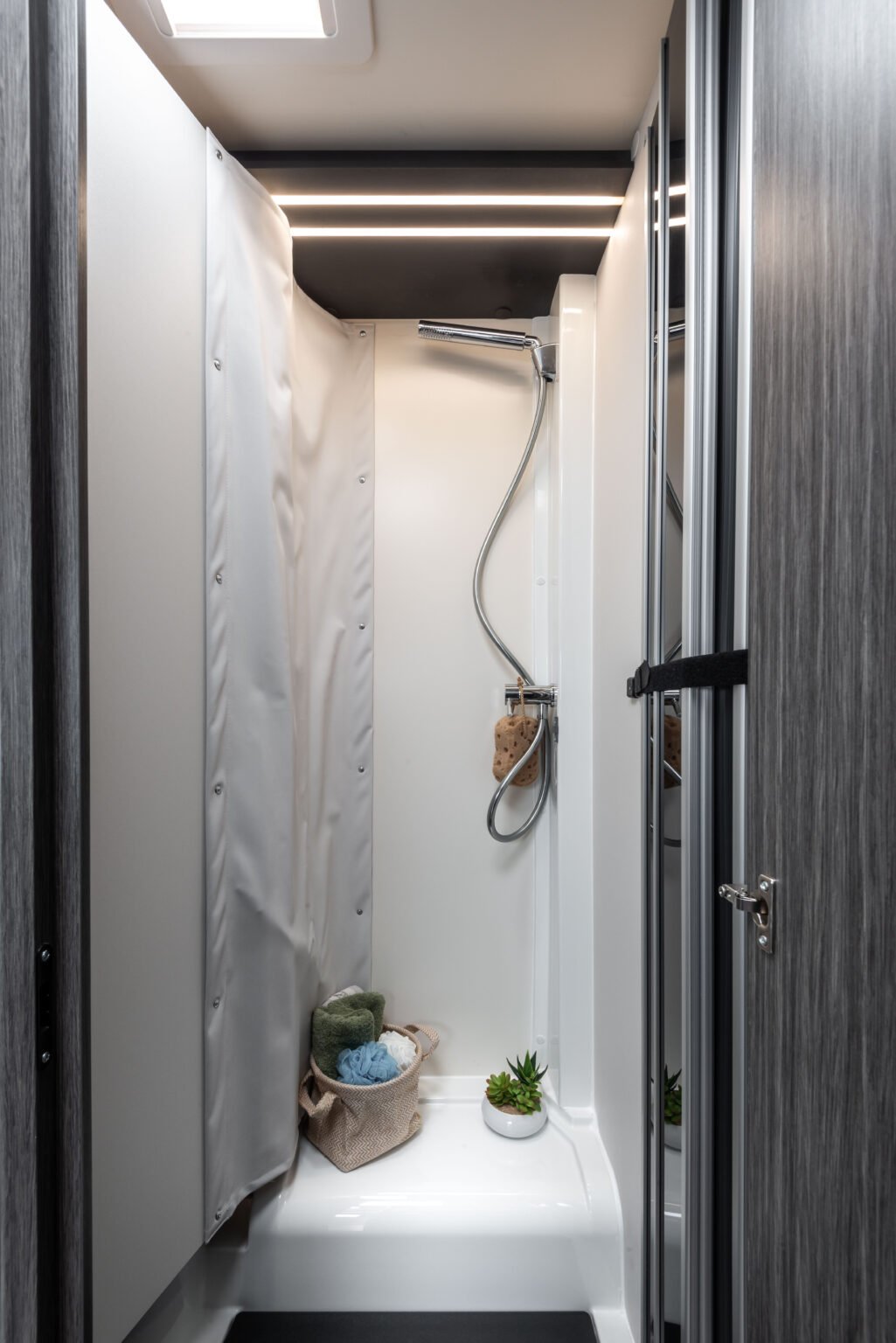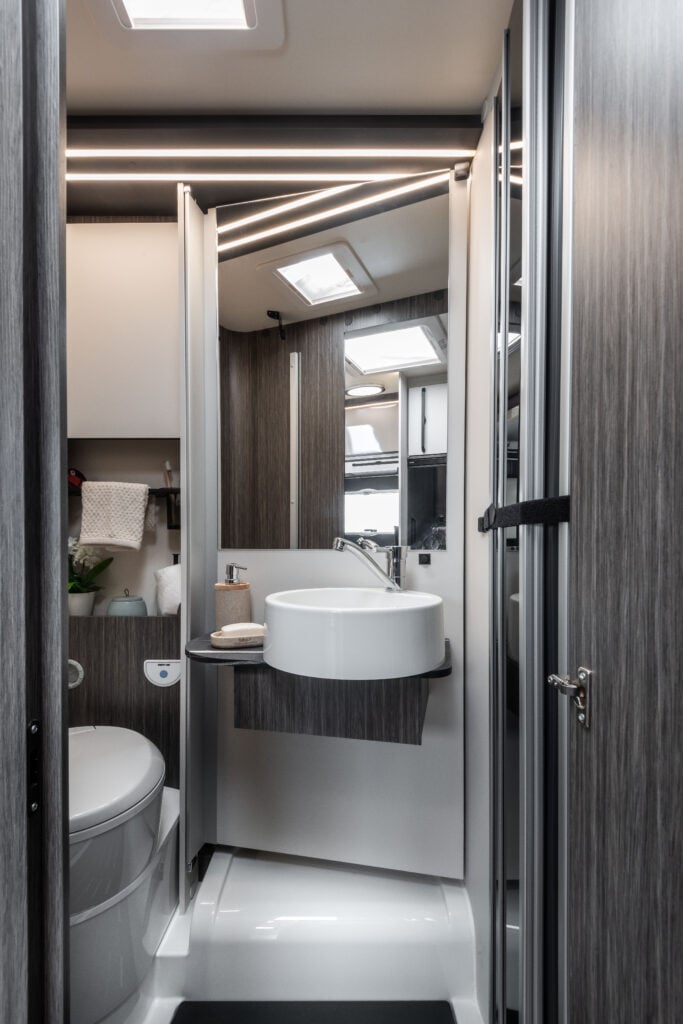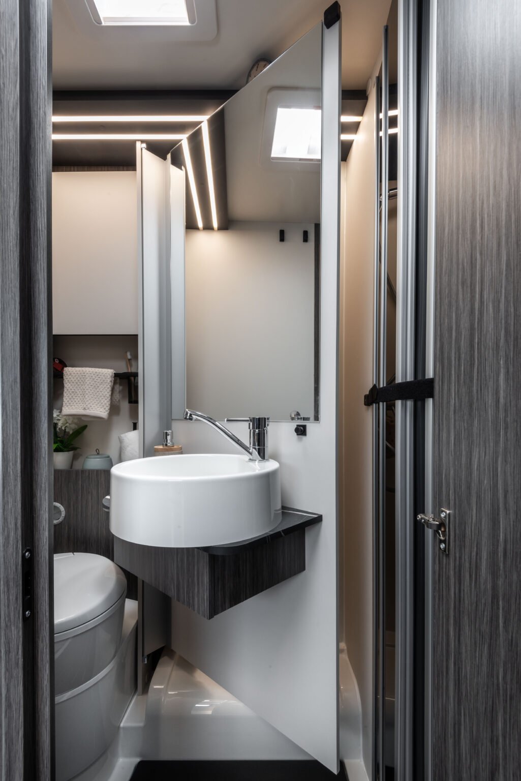 The variable-volume bathroom allows you to adjust the space according to your needs. The rotating washbasin wall allows you to create a larger toilet or shower, for flexible use. The space is completed by a portlight that provides natural light and ventilation, a large mirror and a double compartment with a push-lock door, ideal for organising your personal items.