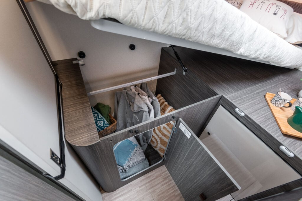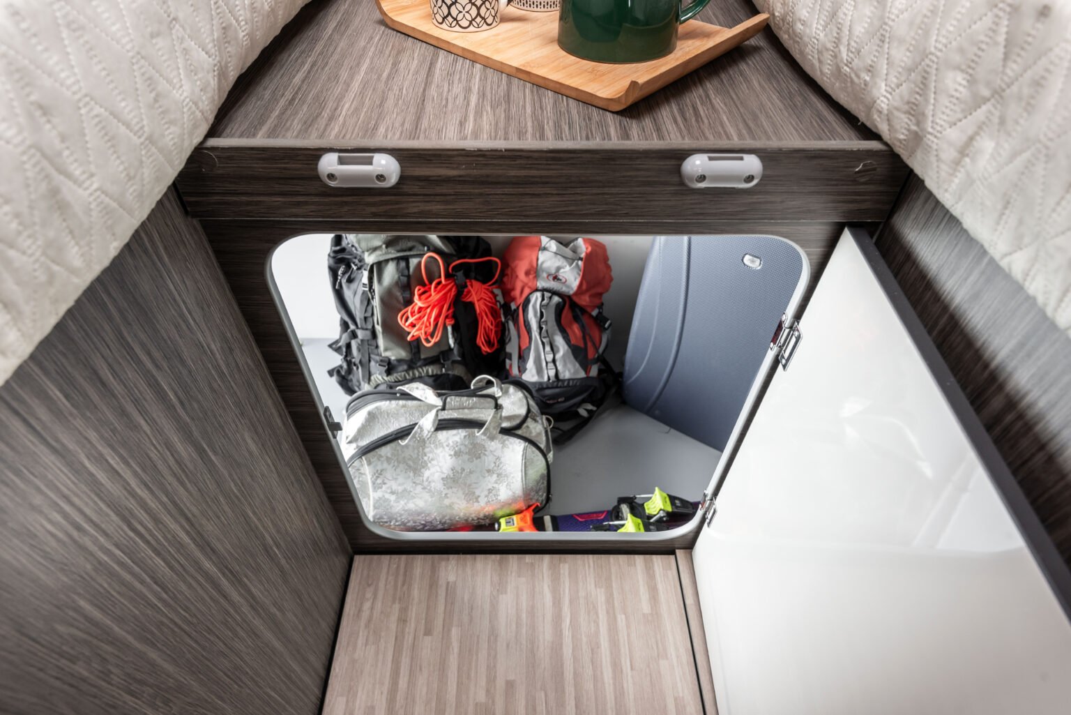 The sleeping area is designed for comfort and functionality, with one of the twin beds measuring 2 metres in length. The lift-up bed bases allow you to use the space underneath for storage, while the practical garage access door makes it easy to organise bulkier items. The space is completed by a large wardrobe and wall units with double side shelves, to keep everything tidy and easily accessible.