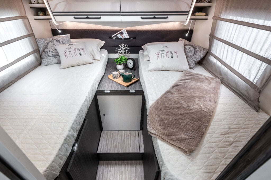 Low-profile with elevating bed under 7 metres with twin beds in the back, with one of the two beds exceeding two metres in length.