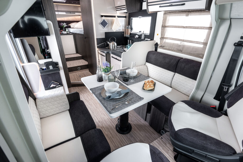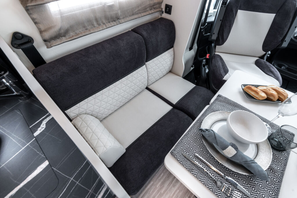 The living area combines spaciousness, brightness and functionality, creating a welcoming and versatile environment, ideal for moments of relax and conviviality. It can accommodate up to five people, ensuring comfort and freedom of movement. The 360° rotating and sliding table offers maximum flexibility for meals and socialising.