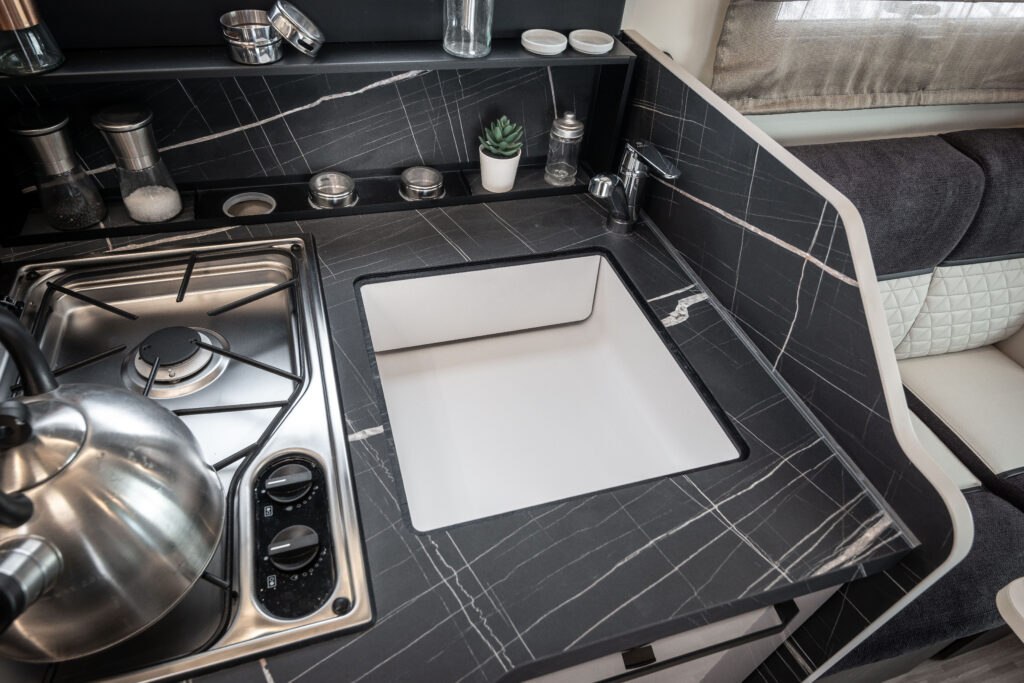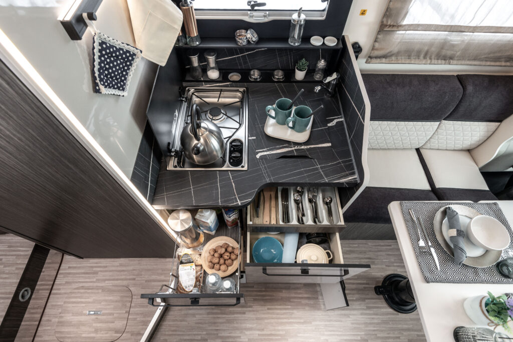 The kitchen combines style and maximum practicality, creating a functional and pleasant environment to live in. The premium 2-burner hob and sink with invisible drain and integrated sponge holder ensure convenience and ease when preparing meals. The large storage compartments, including wall units with shelves, soft-close baskets and internal drawers, allow you to organise utensils and supplies efficiently.