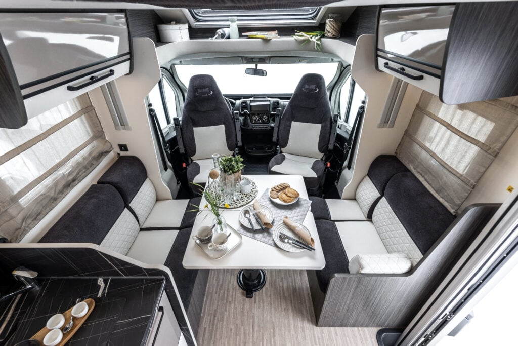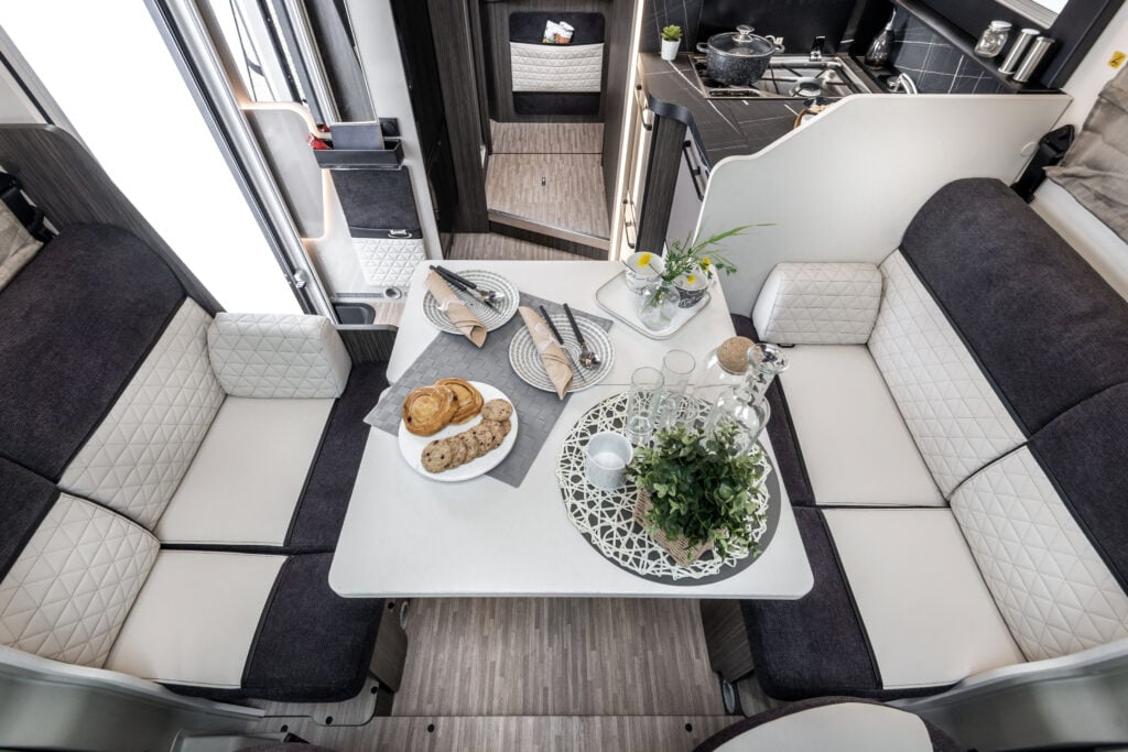 The living area with face-to-face dinette welcomes you into a spacious and bright environment designed for relaxation and conviviality. The ergonomic, spacious, and well-distributed seats guarantee comfort and freedom of movement at any time of day. The glossy laminate folding table with anthracite leg, which can be moved and rotated 360°, combines elegance and functionality, offering maximum practicality both during meals and daily activities.